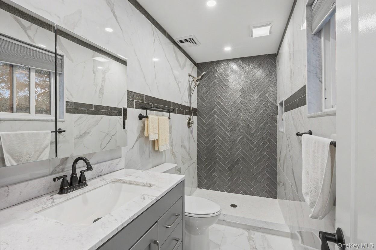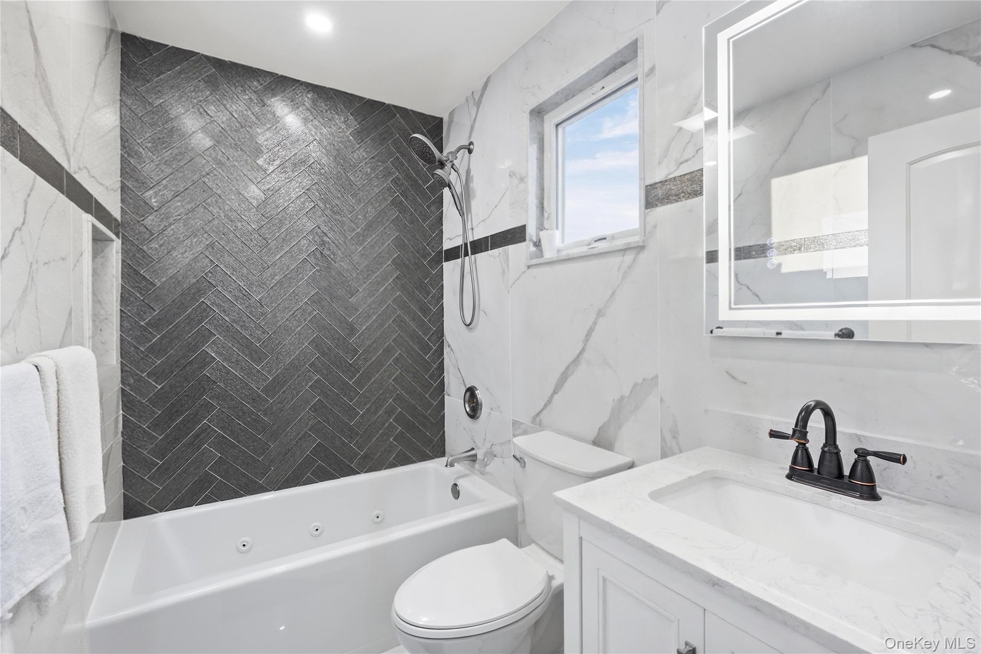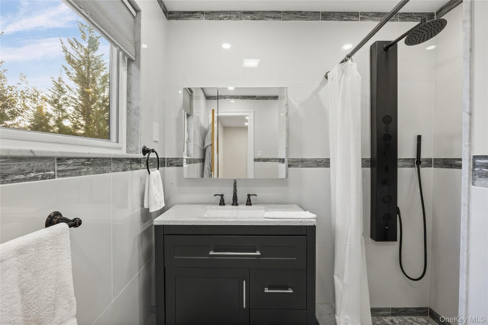 - Bathroom featuring vanity, a combined bath / shower with jetted tub, and tile walls