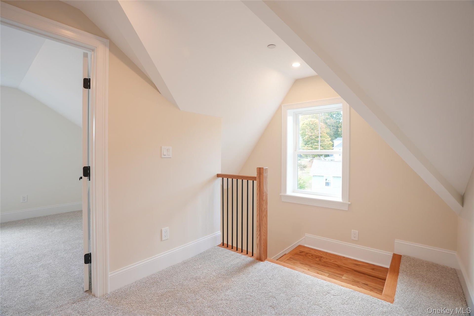 - Additional living space with lofted ceiling, recessed lighting, and light colored carpet