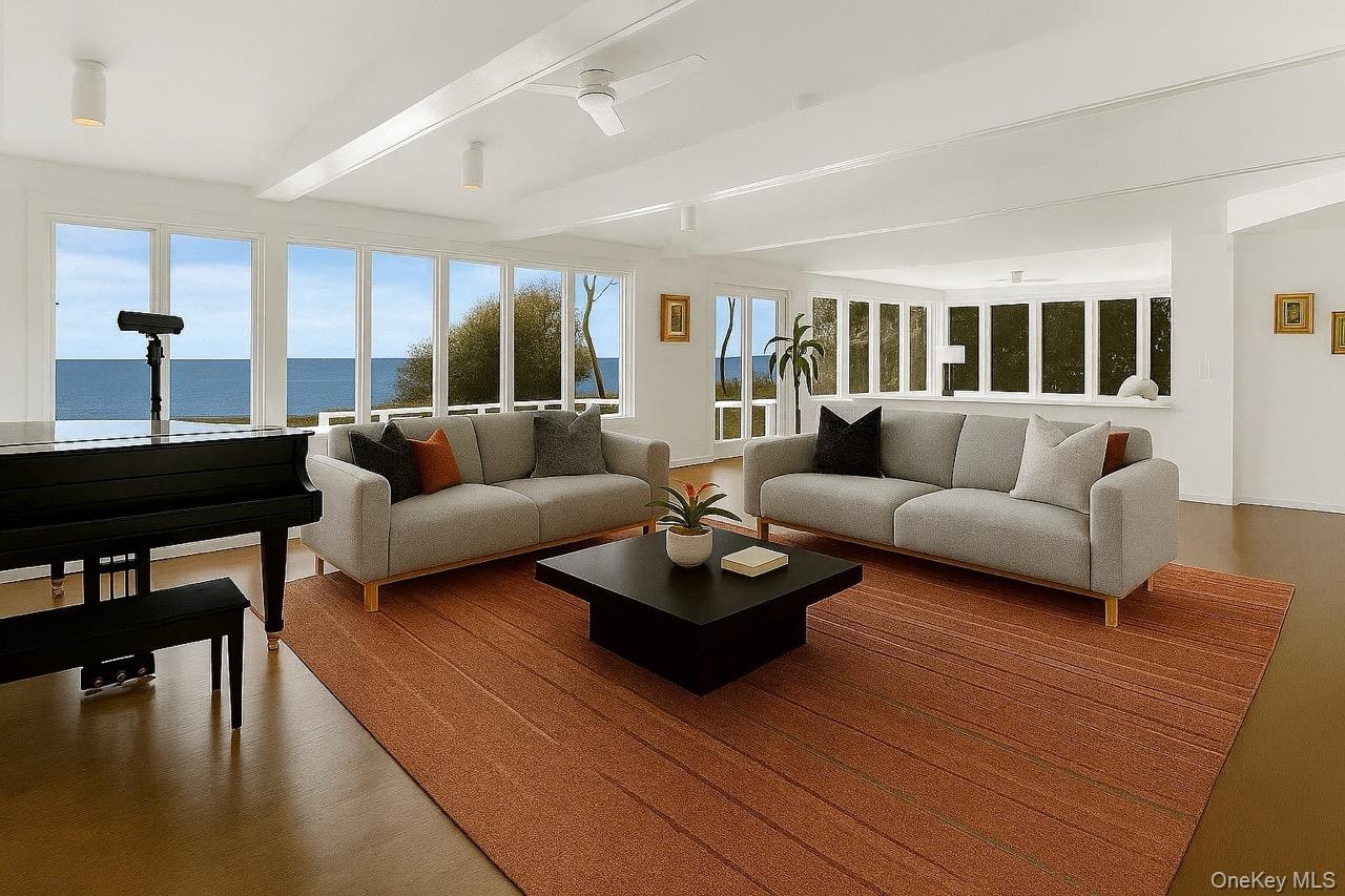 - Great Room with panoramic water views and custom finished hardwood floors throughout
