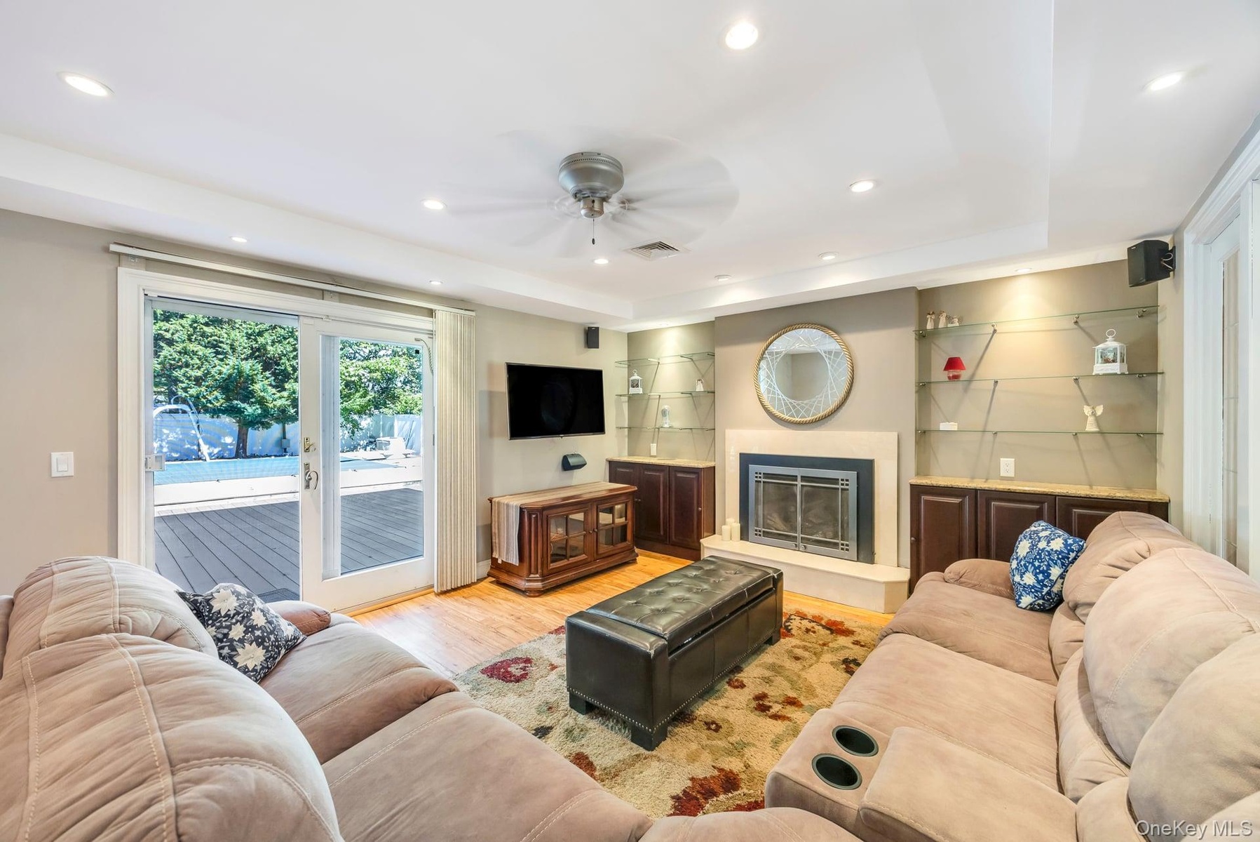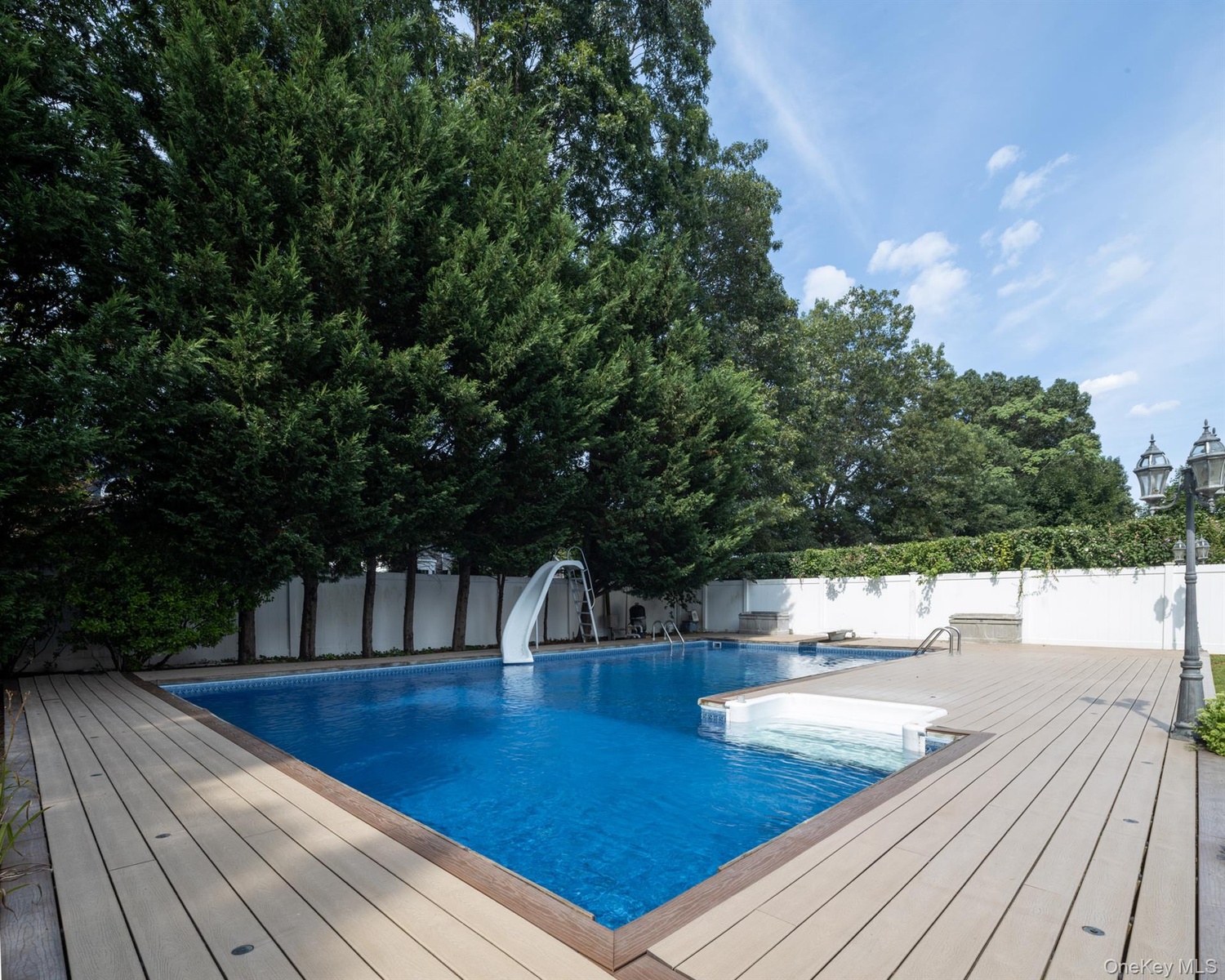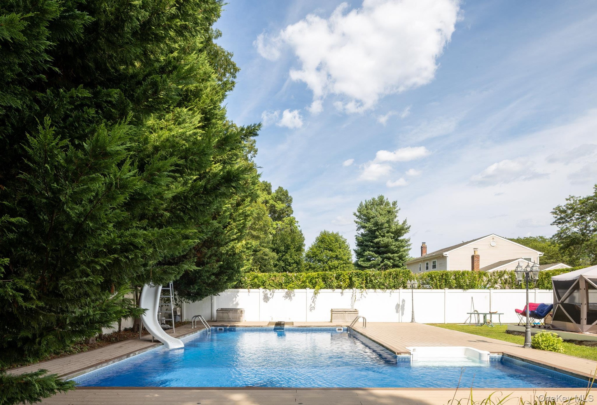 Incredible opportunity to own a magnificent colonial set on just shy of a half-acre corner lot on a quiet dead-end street, boasting stunning curb appeal with a beautiful blacktop driveway, paving stone borders, skirt, front path, and porch, all framed by elegant white PVC fencing. The exterior features full vinyl siding with a custom lower-level stone facade and cedar impression vinyl above, blending timeless craftsmanship with low-maintenance durability. Step into a resort-style backyard designed for entertaining, complete with multi-level Trex decks for no-maintenance enjoyment, multiple seating areas, and a sparkling inground swimming pool with a brand-new liner, all set within a fully fenced, private yard. Inside, an open and sun-filled floor plan showcases rich hardwood floors, custom molding, and detailed millwork throughout. The dining room flows seamlessly into the chef’s kitchen, which is equipped with maple cabinetry, tile countertops, stainless steel appliances, and a gas range with abundant counter and storage space. The formal living room transitions into a dramatic great room with coffered ceiling, recessed lighting, ceiling fan, built-in cherry cabinetry with granite counters, glass shelving, and gas fireplace with sliders to the yard. A stylish powder room with wainscoting and a dedicated laundry room with front-loading washer and dryer complete the first floor. Upstairs, the expansive primary suite is a true retreat, featuring hardwood floors and a spa-like bath with floor-to-ceiling tile, oversized glass shower, double vanity with granite countertops, and towel drying rack. Additional spacious bedrooms and a beautifully appointed hall bath with glass tub/shower complete the second level. The home is enhanced by central AC, efficient gas heat, and placement within the highly sought-after Smithtown School District.