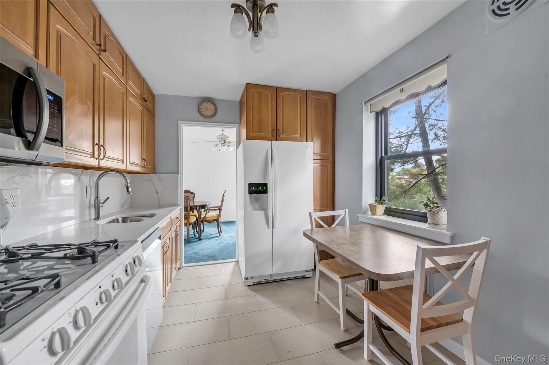 - Kitchen with white gas range, fridge with ice dispenser, ceiling fan, stainless steel microwave, and brown cabinets