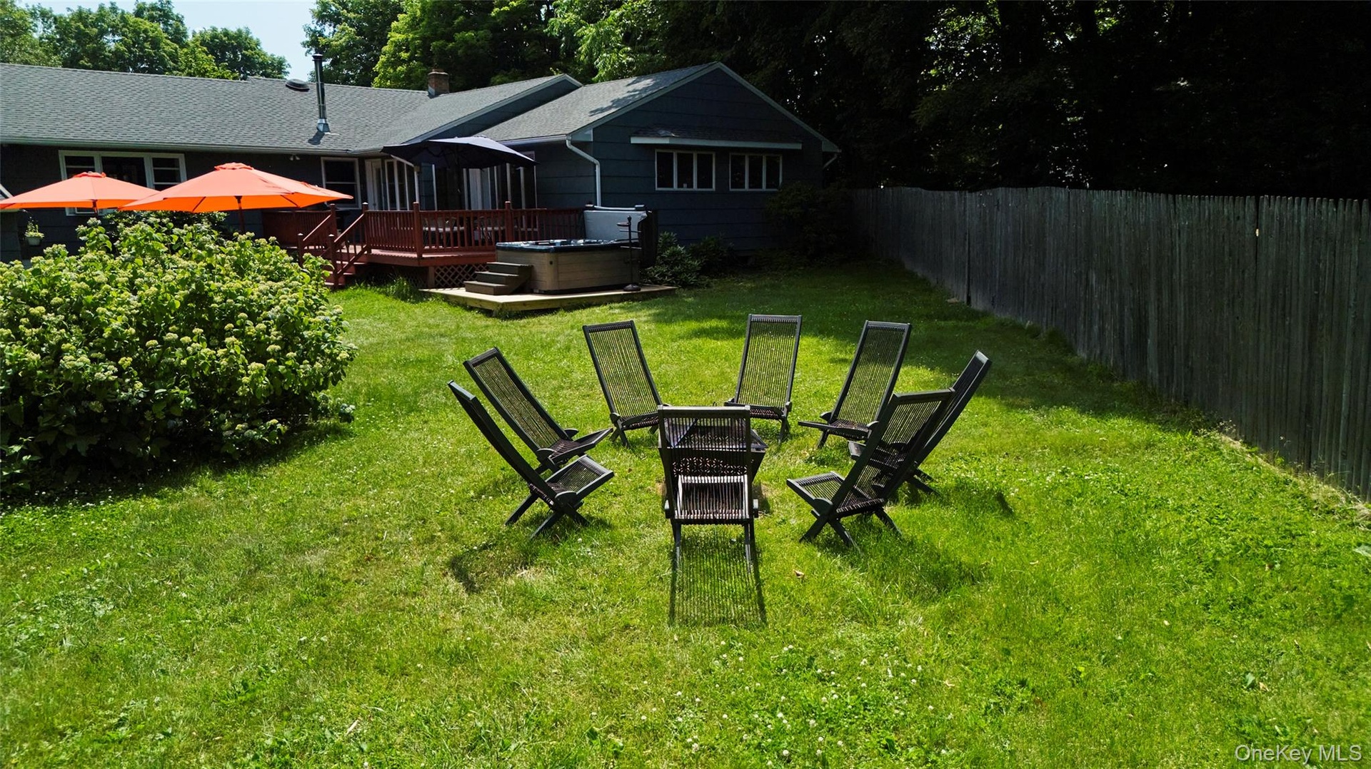 - Fenced backyard with an outdoor fire pit and a wooden deck