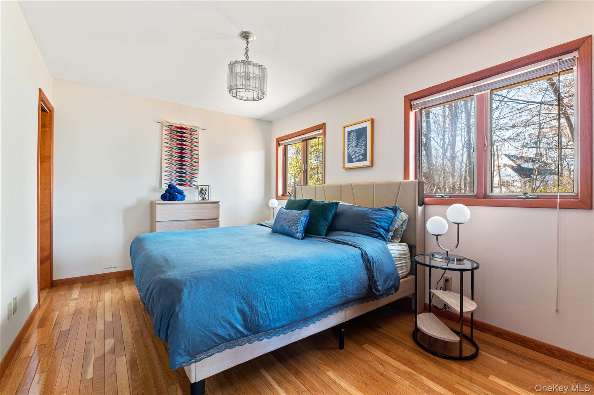- Bedroom with light wood-style flooring, multiple windows, a closet, and a chandelier