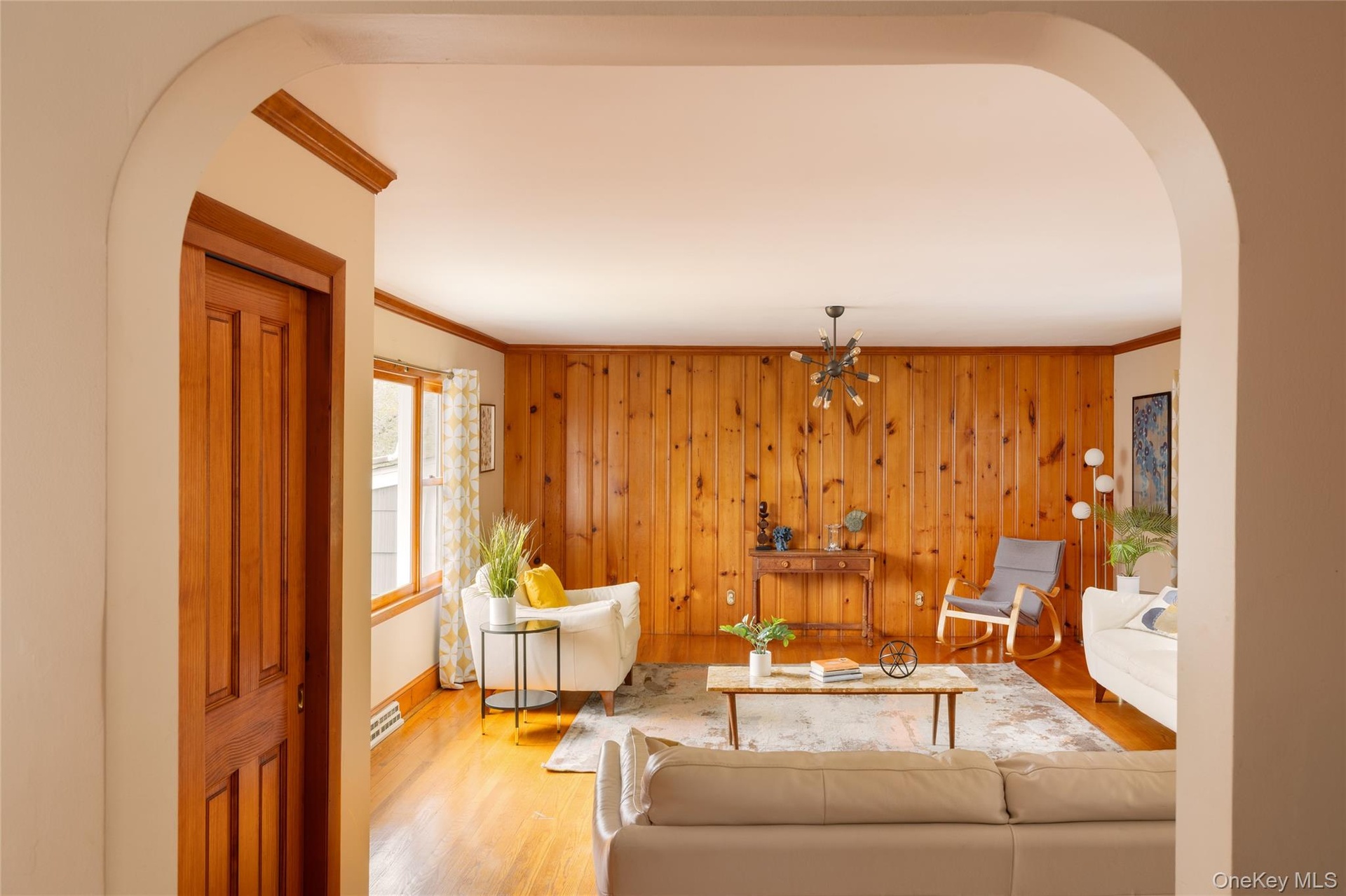 - Living area featuring arched walkways, ornamental molding, wood finished floors, wood walls, and a chandelier