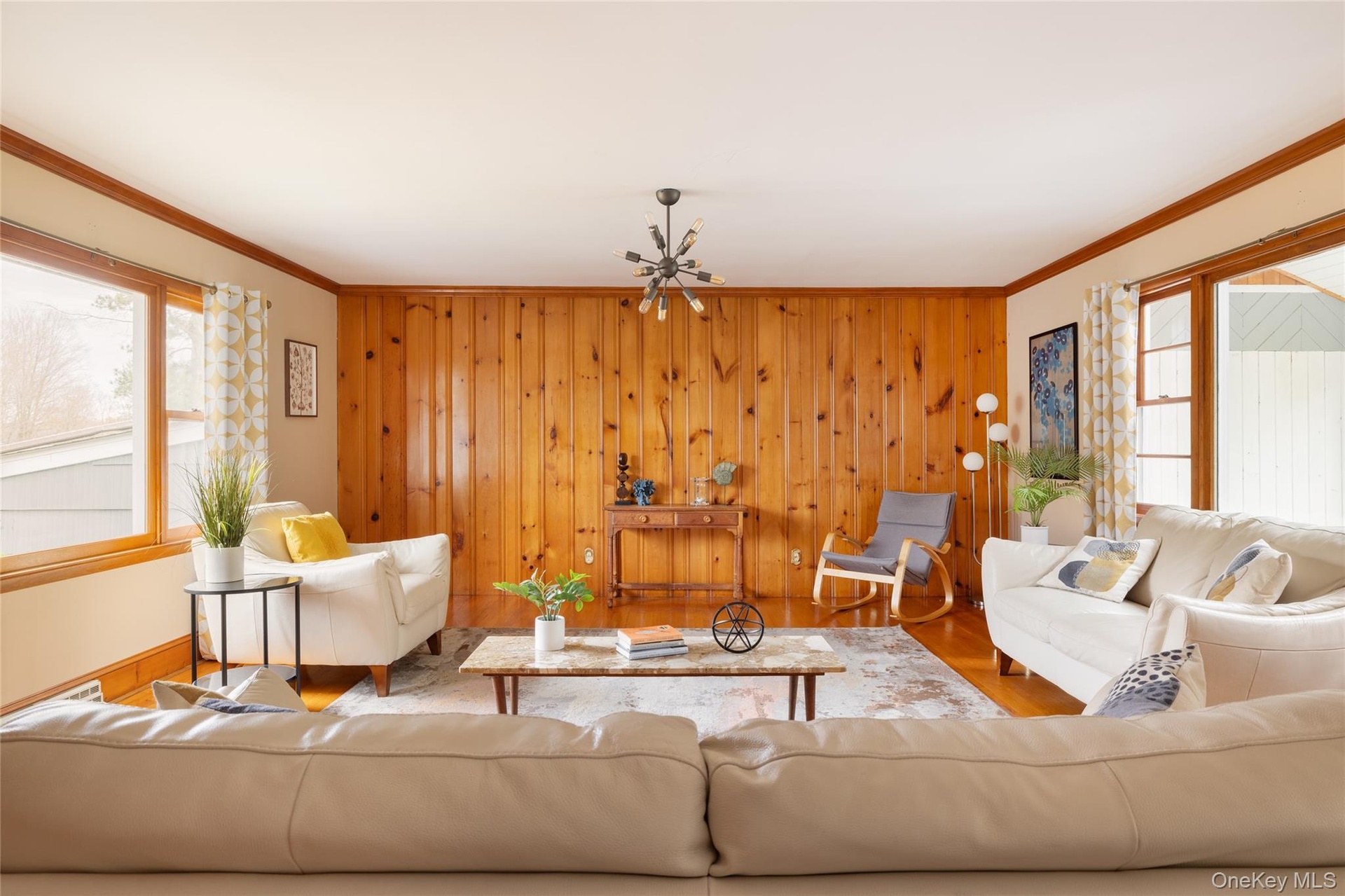 - Living room featuring ornamental molding, wood walls, wood finished floors, and a chandelier
