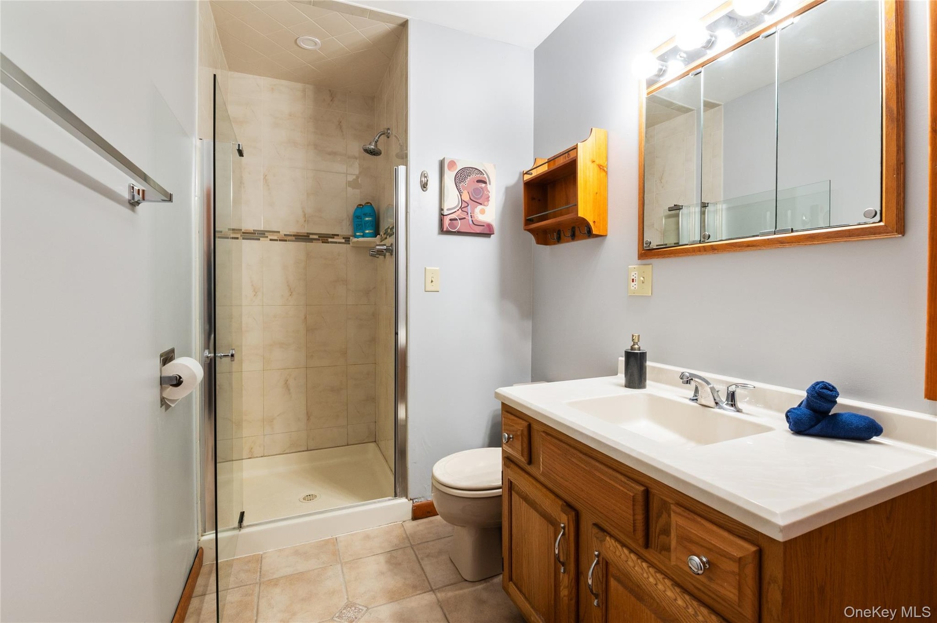 - Bathroom featuring a shower stall, vanity, and light tile patterned floors
