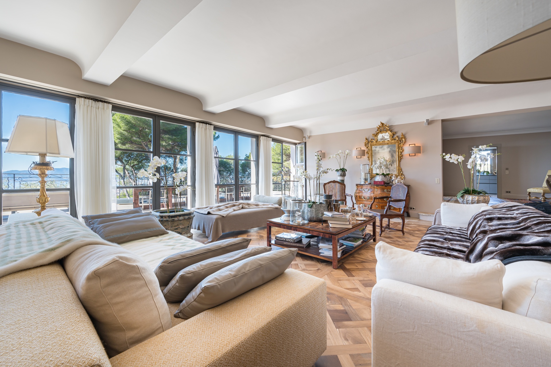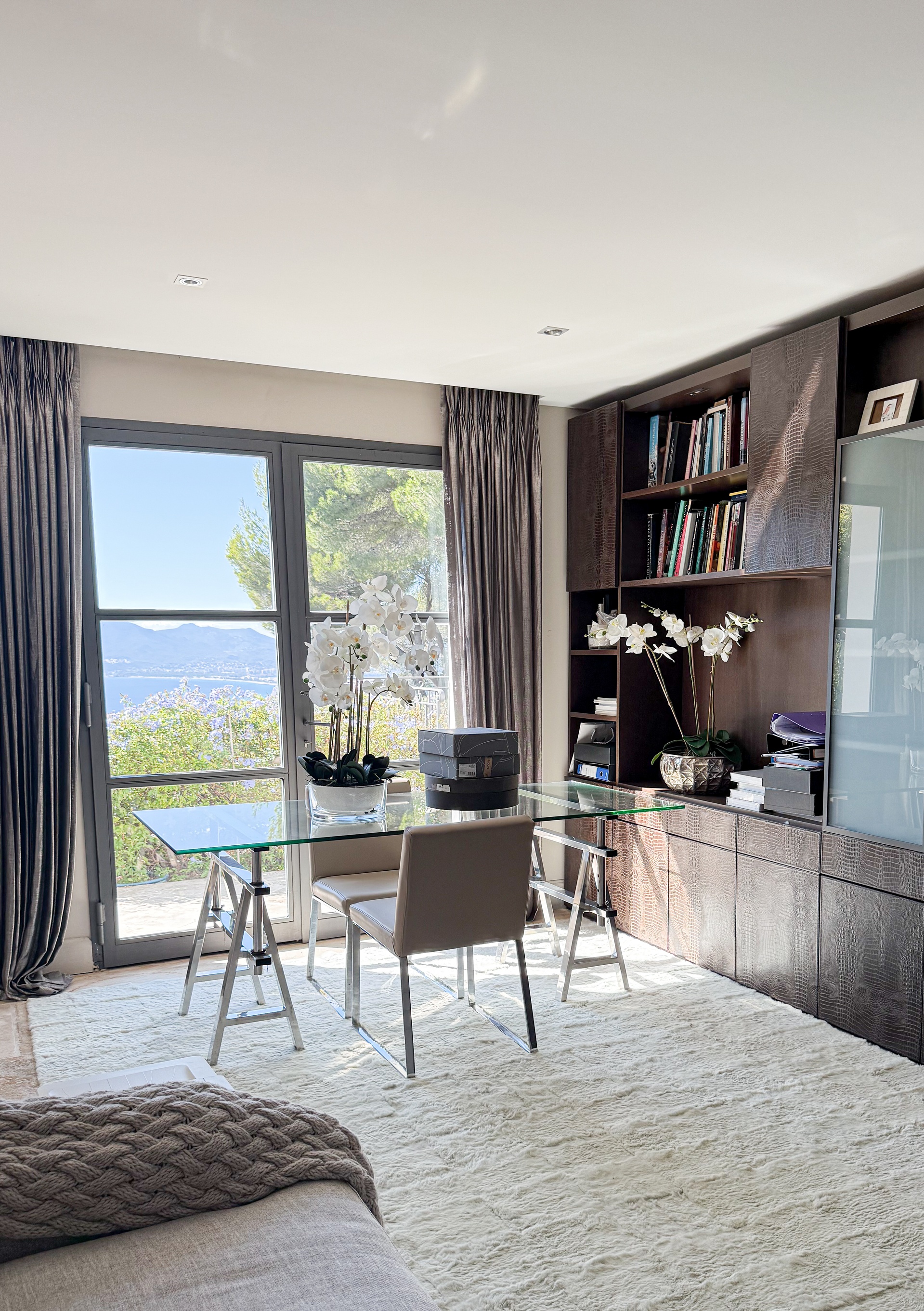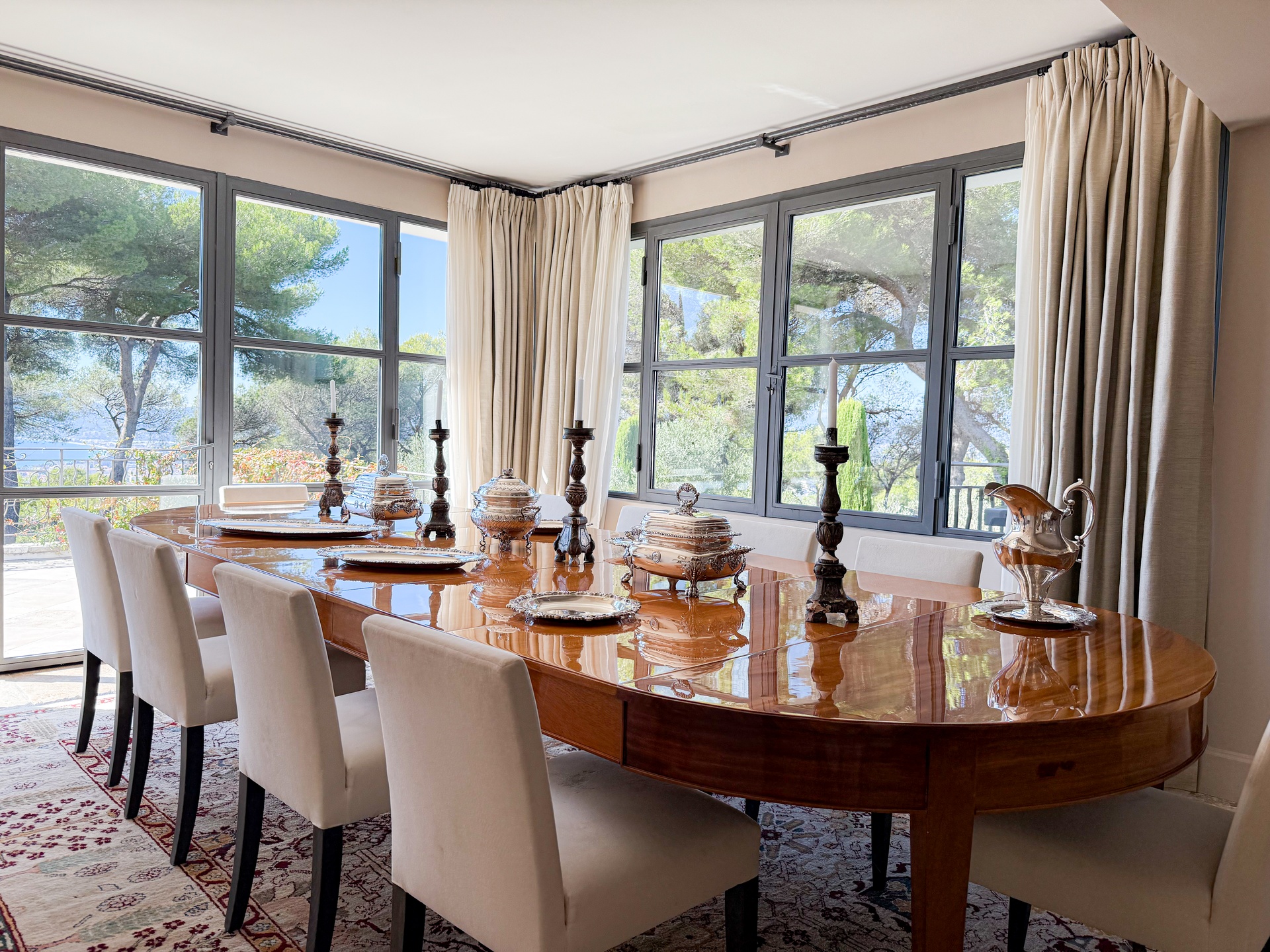 Alliant élégance contemporaine et charme intemporel, la villa se distingue par ses parquets en bois noble, ses tissus raffinés et ses larges baies vitrées offrant une lumière naturelle abondante et des vues spectaculaires sur la Méditerranée. Le rez-de-chaussée abrite un vaste espace de vie ouvert comprenant salon, salle à manger et cuisine, s’ouvrant sur la terrasse principale surplombant les jardins et la mer.