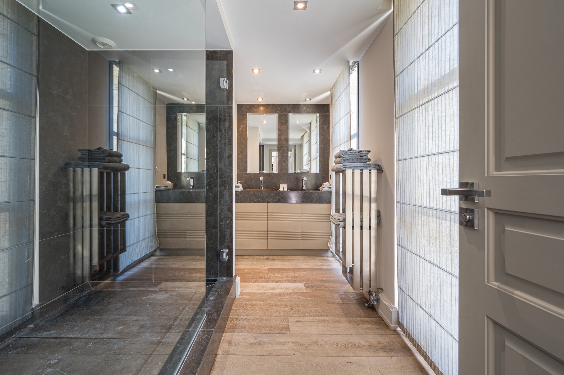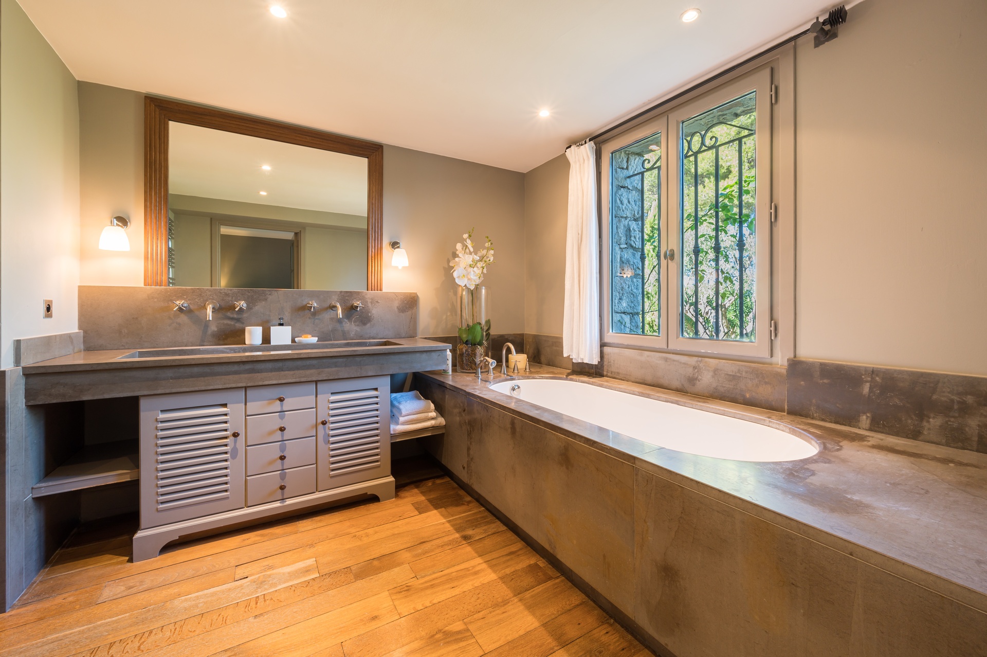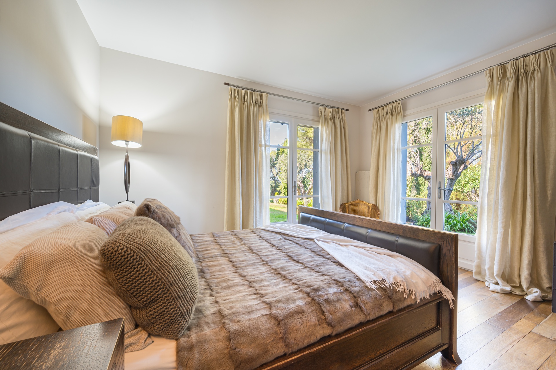 Outside, the landscaped gardens adorned with olive trees frame a magnificent outdoor living area, perfect for alfresco dining or simply relaxing under the Côte d’Azur sun. Guests can unwind in the outdoor hot tub after a swim in the infinity pool, while the spacious pool house features a summer kitchen, lounge, private gym, massage room, and hammam — offering the ultimate in luxury and well-being.