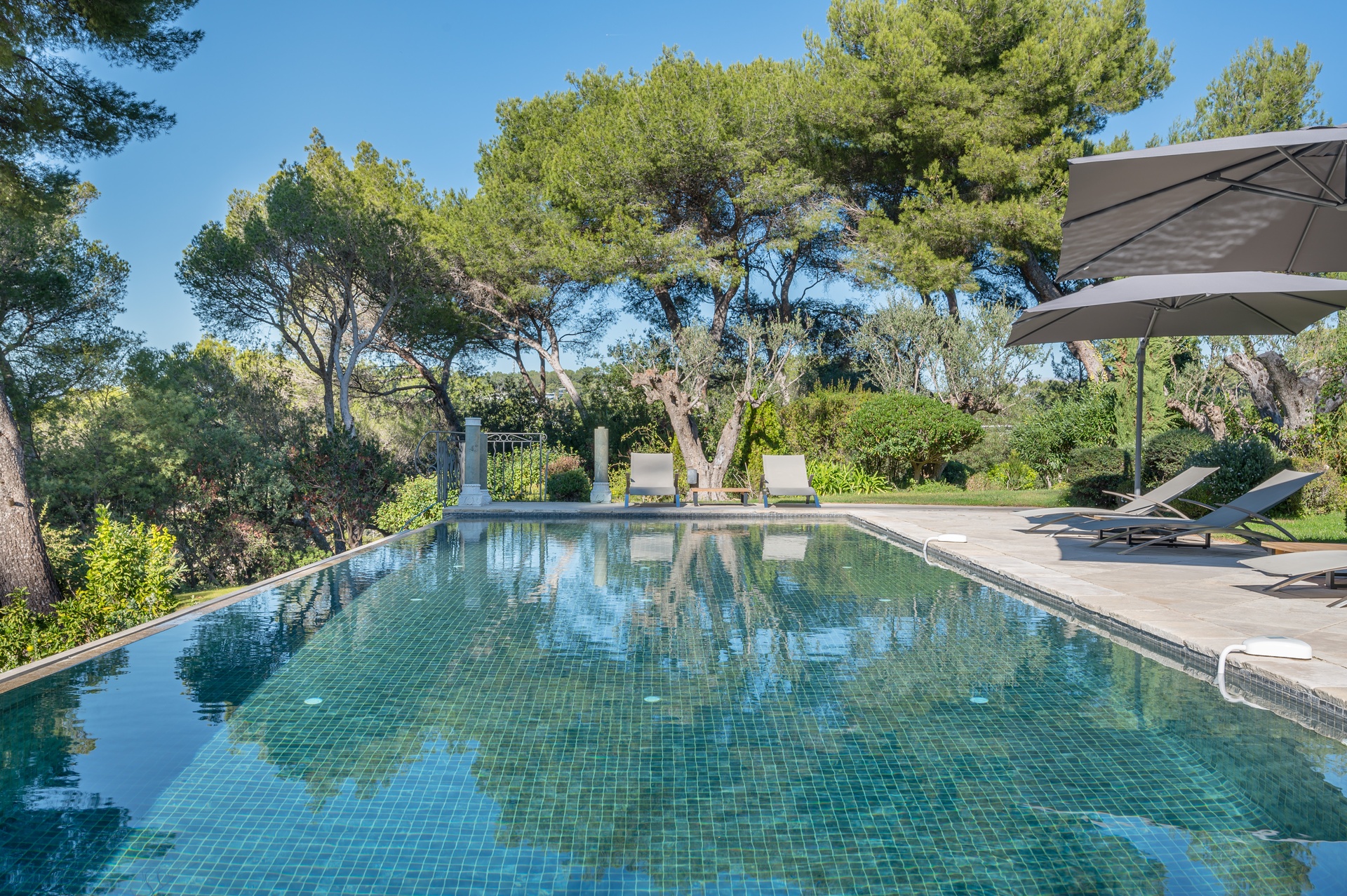 À l’extérieur, les jardins paysagers agrémentés d’oliviers entourent un superbe espace de détente, parfait pour des repas en plein air ou des moments de farniente sous le soleil azuréen. Les hôtes pourront se relaxer dans le jacuzzi extérieuraprès une baignade dans la piscine à débordement. Le pool house spacieux comprend une cuisine d’été entièrement équipée, un salon, une salle de sport privée, une salle de massage et un hammam — une véritable oasis de luxe et de bien-être.
