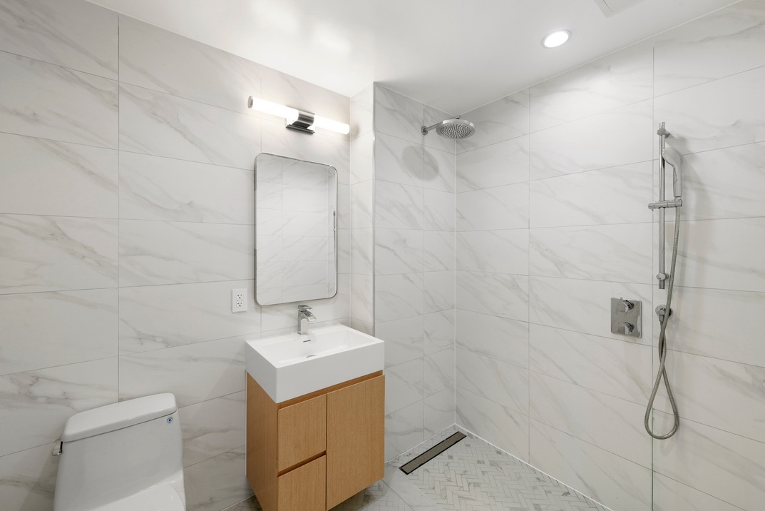 The home begins with an open-concept living room, dining room, and kitchen saturated with south-eastern light. The kitchen is subtle and refined, with sleek white Carrara quartz countertops and backsplashes, custom-engineered grey oak cabinets, and high-end integrated, full suite Bosch appliances. The bedroom has a reach-in and walk-in closets and easy access to a chic bathroom with herringbone porcelain floors, smooth slab walls, a custom vanity, a Toto toilet, and a walk-in shower with state-of-the-art rain and handheld showerhead fixtures. The seller has added upgrades to the space, including built-out in closets and custom lighting through.