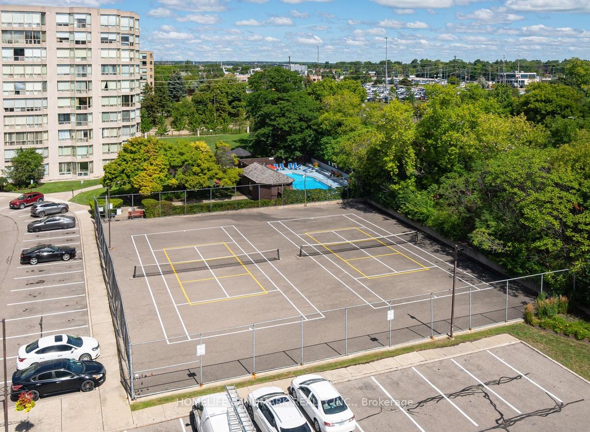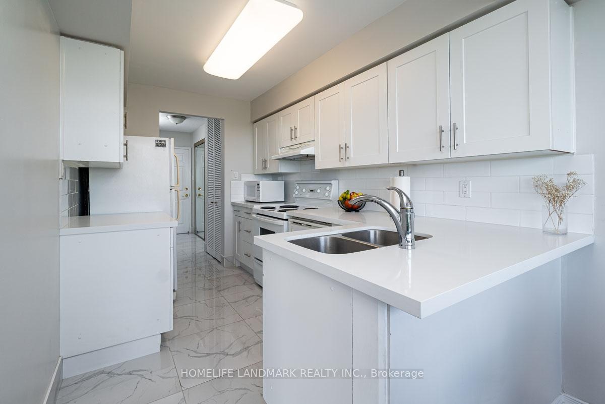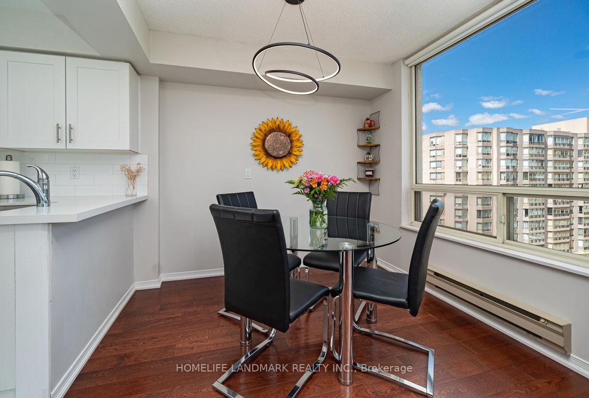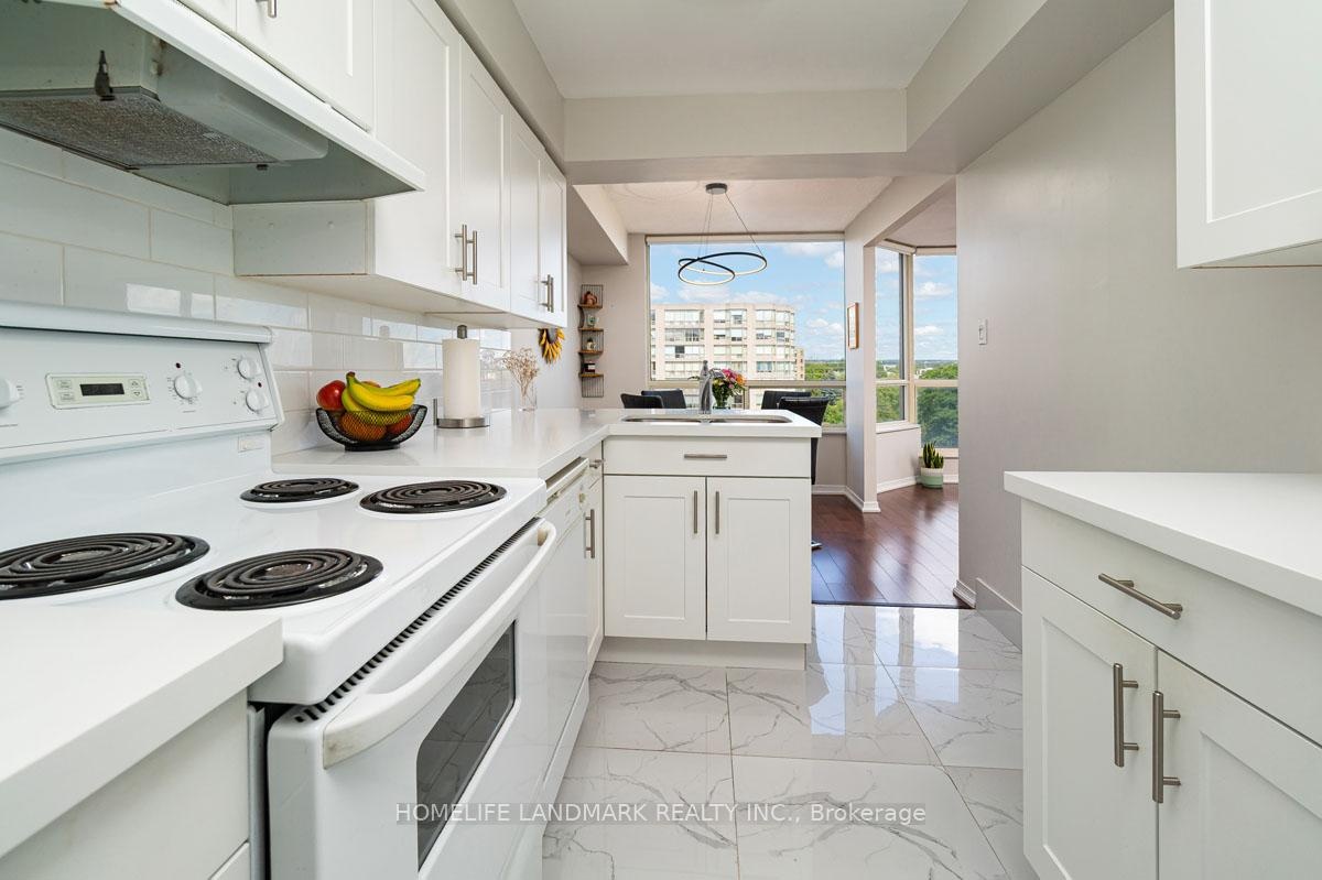 This expansive 2-bedroom, 2-bathroom corner suite facing North-East with a view of swimming pool and tennis court with added solarium spans approximately 1336 sq. ft. and is bathed in natural sunlight. Step through an upgraded, modern kitchen featuring porcelain tiles and quartz counters. The primary suite offers a walk-in closet and 4-pc ensuite bathroom. Having a solarium ideal for home-office or gym. For recreation and wellness, enjoy access to a fitness centre, outdoor pool, tennis and squash courts and saunas-all within your building. Situated just a stroll from Go transit and local buses, and close to shopping, schools, parks, and dining, this home perfectly balances tranquil living with urban convenience. Don't miss this fusion of cofort, luxury and lifestyle in one exceptional condo home.
