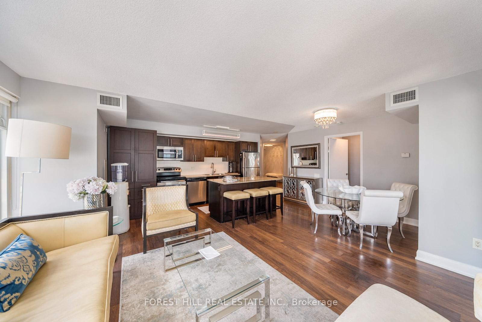 A Premium Condo in the Sky! Experience elevated living in this spectacular corner suite on the23rd floor in the heart of Yonge & Eglinton-where midtown energy meets modern luxury. With approximately 1,100 sq. ft. of living space, this bright 2-bedroom, 3-bathroom residence features sweeping northeast views through wraparound floor-to-ceiling windows, flooding every room with daylight and showcasing sparkling city views by night. Step onto the 56 sq. ft. balcony to enjoy quiet moments above the city. Beautiful hardwood floors flow throughout the open-concept living, dining, and kitchen areas, designed for both comfort and elegant entertaining. The modern kitchen boasts granite counters, a centre island with storage & seating, and an upgraded pantry addition. The thoughtful split-bedroom layout ensures privacy. The primary suite offers south-east views and is a serene retreat with a walk-in closet, 4-piece ensuite, and dramatic floor-to-ceiling windows with blackout drapery, enhanced by designer wall sconces and a statement chandelier. The second bedroom features custom designer wallpaper, full-height blackout drapery, and its own luxurious 4-piece ensuite with a glass-and-marble shower and upgraded vanity. Newer upgraded wide plank hardwood floors add sophistication to both bedrooms. Includes one underground parking space (P4-55) and an adjoining locker for extra convenience! Residents enjoy premium amenities including guest suites, indoor pool, gym, party room, roof-top deck and 24-hour concierge service and security. Steps from the subway, restaurants including The Keg, cafes, shopping, fitness centres/spas, Farm Boy/Loblaws, & the Cineplex Theatre-this is midtown living at its finest. The Quantum 2 North Tower is a truly exceptional condo in one of Toronto's most sought-after locations.