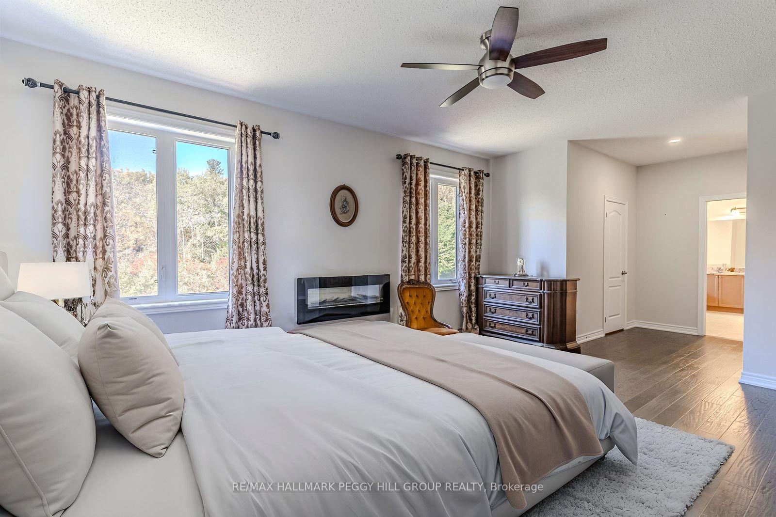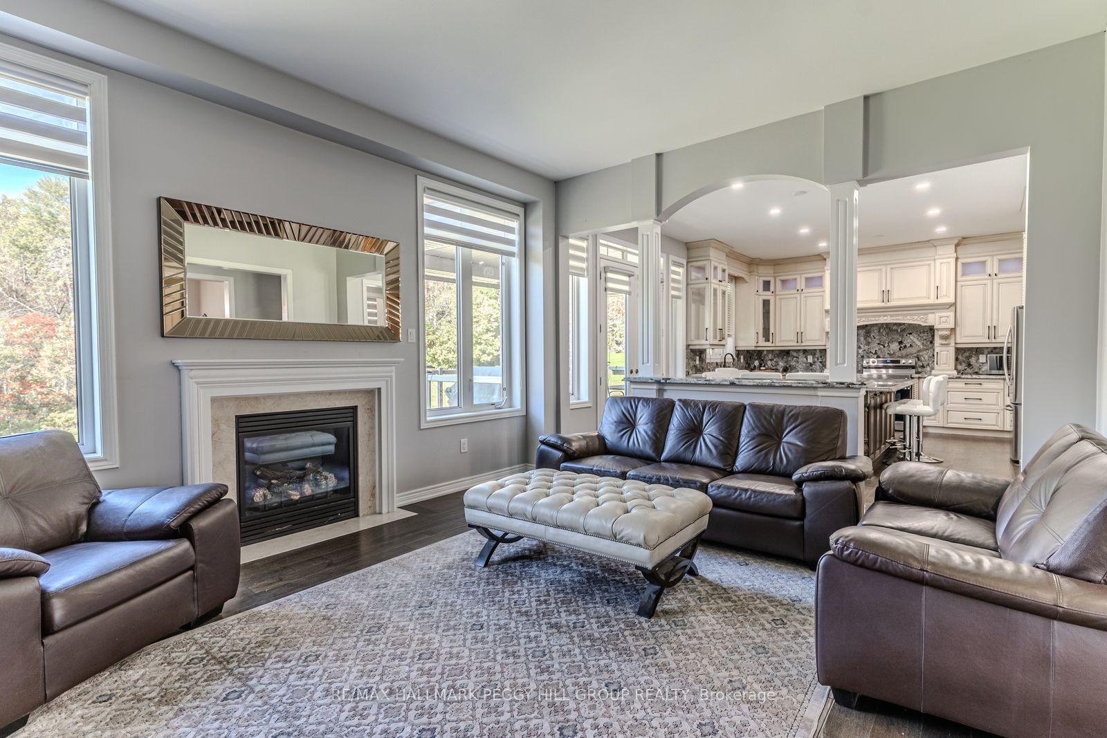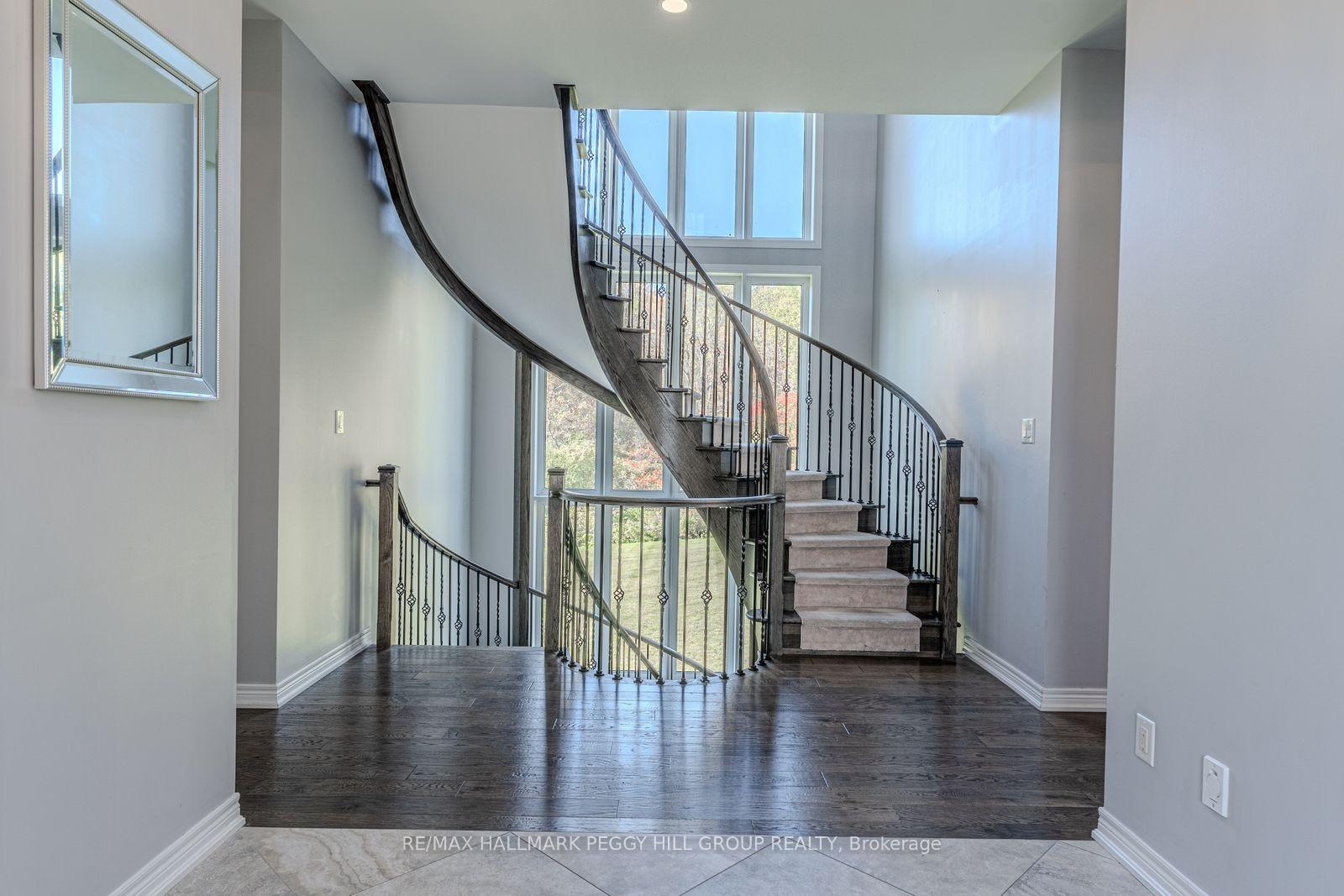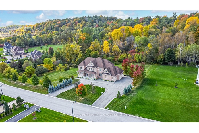 ESTATE HOME SHOWCASING OVER 5,100 SQ FT, IN-LAW POTENTIAL, LUXURIOUS FINISHES, TRIPLE GARAGE, & 2.33-ACRE LOT! Set on a prestigious 2.33-acre estate in The Shires Estates, Bradfords most distinguished country estate community inspired by the timeless charm of the English countryside, this stately all-brick home offers over 5,100 finished square feet of refined living. The impressive exterior showcases a circular driveway, a covered front porch with double doors, soffit lighting, and a triple garage with inside entry. A 20-foot cathedral ceiling, floor-to-ceiling windows, and a grand spiral staircase create a striking first impression, while 10-ft ceilings on the main level and 9-ft ceilings on the upper and lower levels enhance the homes scale. The custom kitchen features granite countertops, a large island, custom cabinetry topped with crown moulding, tile backsplash, stainless steel appliances, and a walkout to the deck. The main level also offers hardwood floors, a formal dining room, a living room with a gas fireplace and built-in cabinetry, two dens, and a laundry room. The generous primary bedroom showcases dual walk-in closets and a 5-piece ensuite with a soaker tub, glass-walled shower, dual vanity, and water closet, while three additional bedrooms feature private or shared ensuite access. The walkout basement provides excellent in-law capability with a kitchen boasting quartz countertops, an island, stainless steel appliances, a large rec room, two bedrooms, two full bathrooms, laundry, and a cantina. Backing onto a ravine with towering trees offering privacy, complete with a covered composite deck with glass railings, a lower-level patio, and an irrigation system. Additional highlights include a drilled well, water softener, filters, UV, reverse osmosis, HRV, high-efficiency furnace, central air conditioning, central vac, and a 200-amp electrical panel. A #HomeToStay of distinction where craftsmanship, scale, and setting exceed expectations.