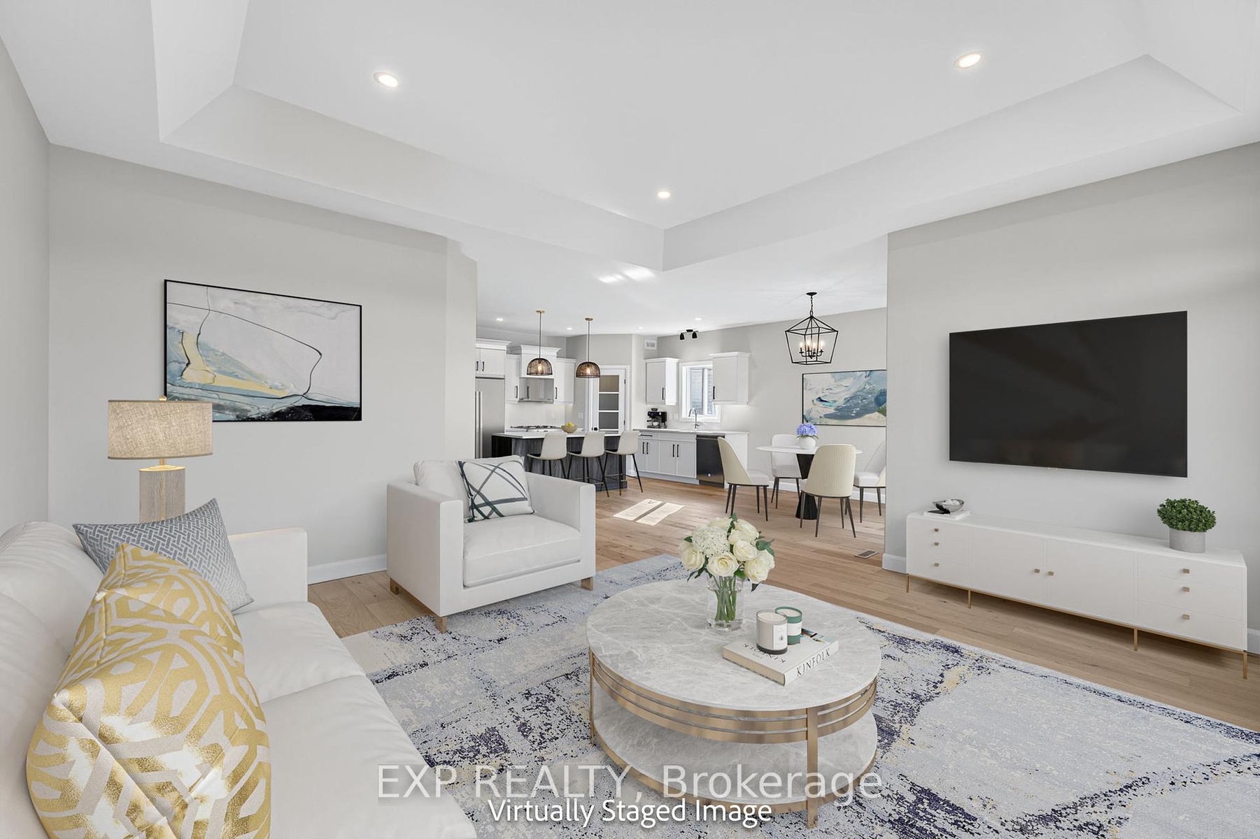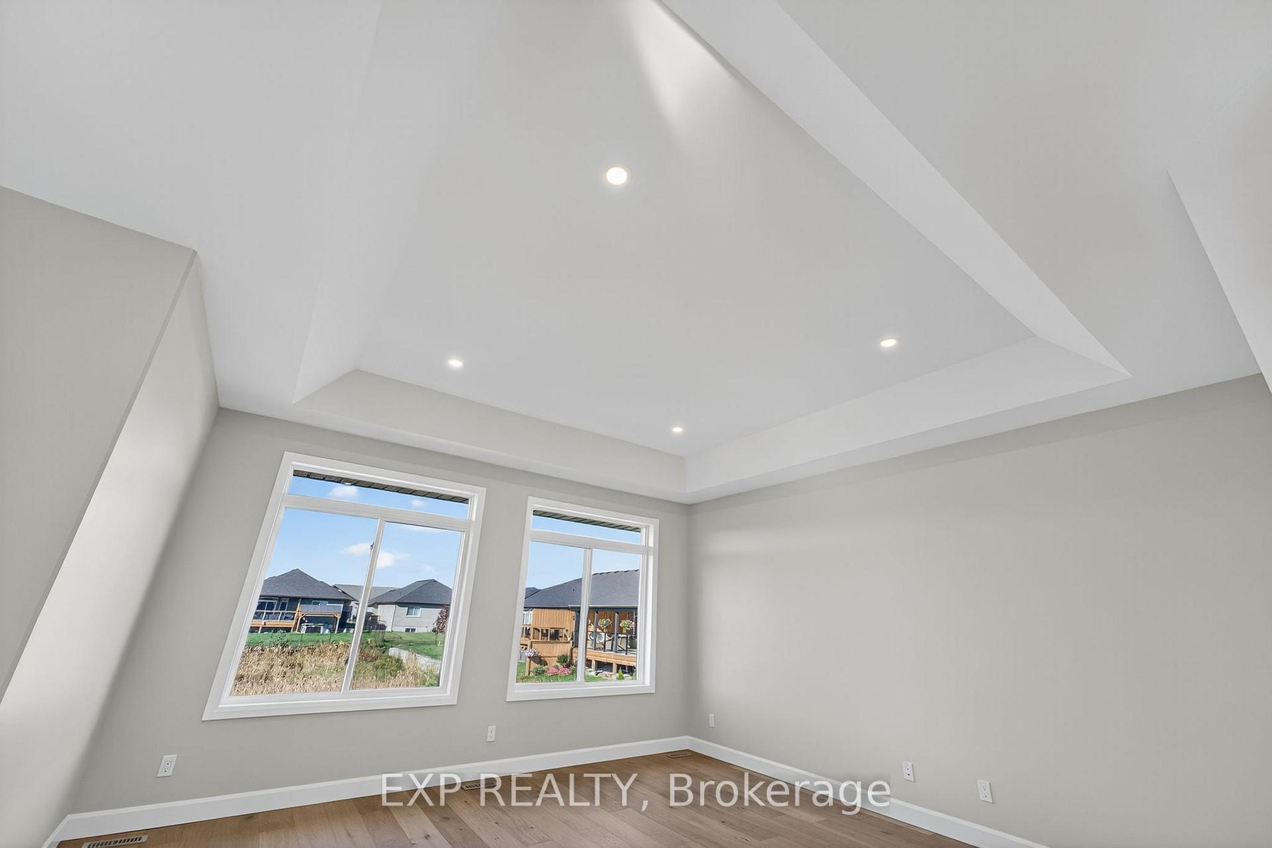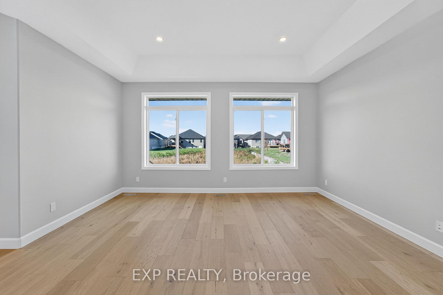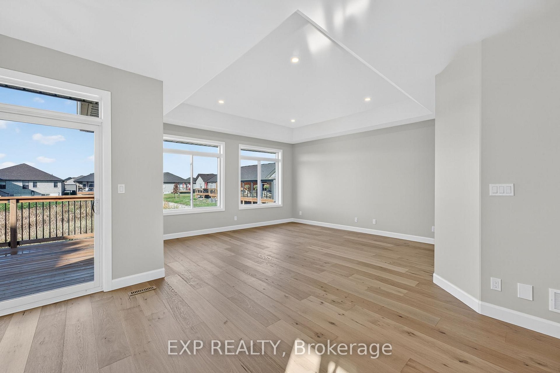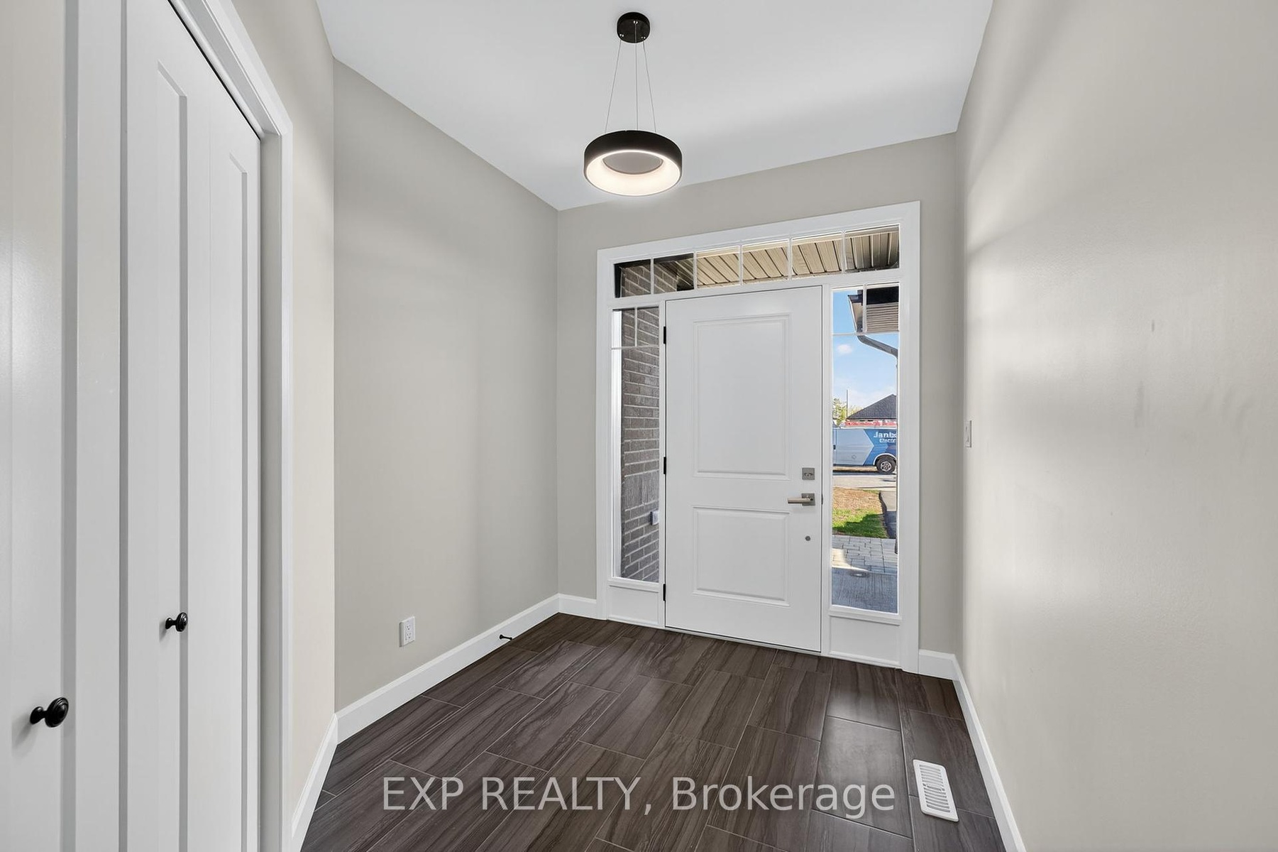 DescriptionMove-in ready and FULLY FINISHED! This 5 bedroom, 3 bathroom Quinte model all brick bungalow by Duvanco Homes sits on a PREMIUM lot on cul-de-sac backing onto green space, offering privacy and peaceful views. Designed with modern living in mind, the open-concept layout features a custom quality kitchen with oversized island, coffered ceiling in the living room and distressed wide plank hardwood throughout the main floor. Modern light fixtures and finishes throughout. The primary suite includes a walk-in closet and luxurious ensuite with double vanity and glass-surround porcelain tile shower. Main floor laundry with access to the attached garage. Lower level finished with 2 bedrooms, 4pc bathroom and recreation room. Exterior landscaping complete with paved driveway, fully sodded yard, garden package and stone walkway. Completed pressure treated deck with black ballisters. This Quinte model home is Holmes Approved. Settlers Ridge Subdivision offers trails, park, asphalt paved sidewalks, green space and is just minutes to all amenities.Amenities- Auto Garage Door Remote