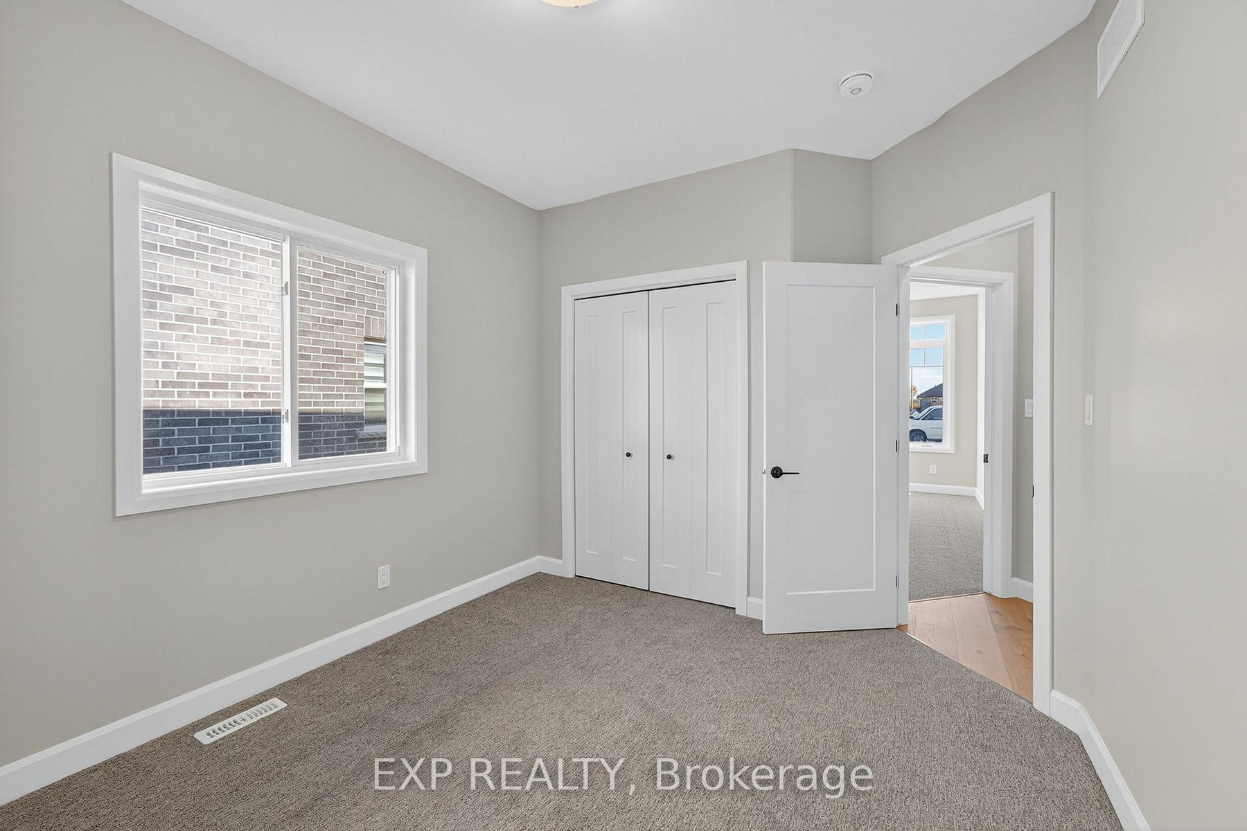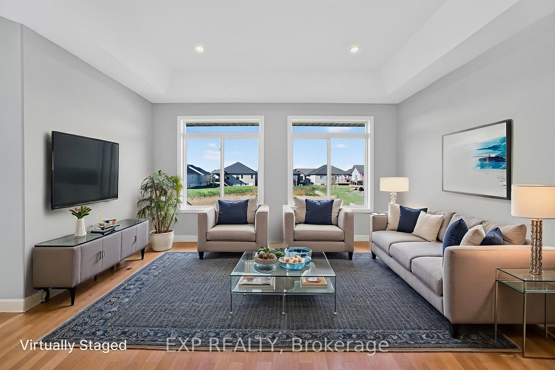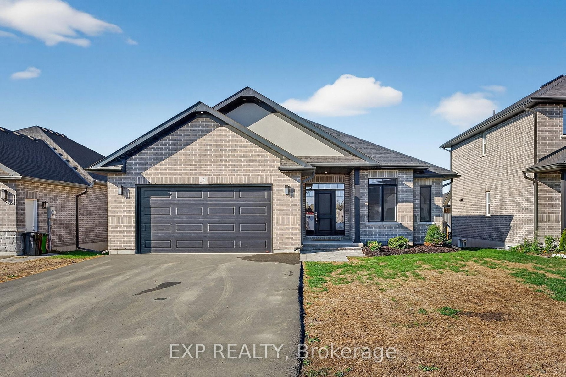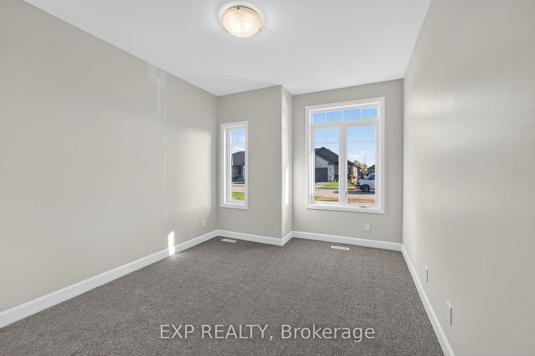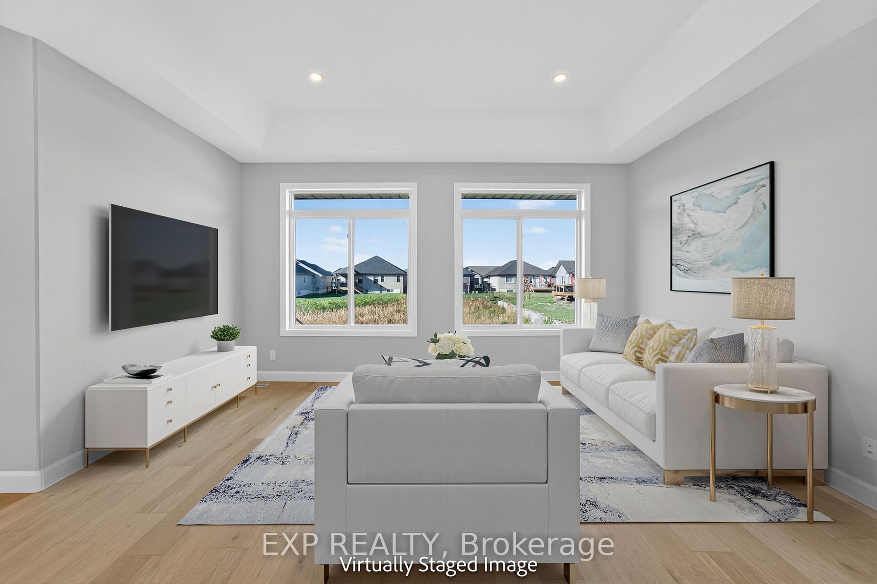 DescriptionMove-in ready and FULLY FINISHED! This 5 bedroom, 3 bathroom Quinte model all brick bungalow by Duvanco Homes sits on a PREMIUM lot on cul-de-sac backing onto green space, offering privacy and peaceful views. Designed with modern living in mind, the open-concept layout features a custom quality kitchen with oversized island, coffered ceiling in the living room and distressed wide plank hardwood throughout the main floor. Modern light fixtures and finishes throughout. The primary suite includes a walk-in closet and luxurious ensuite with double vanity and glass-surround porcelain tile shower. Main floor laundry with access to the attached garage. Lower level finished with 2 bedrooms, 4pc bathroom and recreation room. Exterior landscaping complete with paved driveway, fully sodded yard, garden package and stone walkway. Completed pressure treated deck with black ballisters. This Quinte model home is Holmes Approved. Settlers Ridge Subdivision offers trails, park, asphalt paved sidewalks, green space and is just minutes to all amenities.Amenities- Auto Garage Door Remote