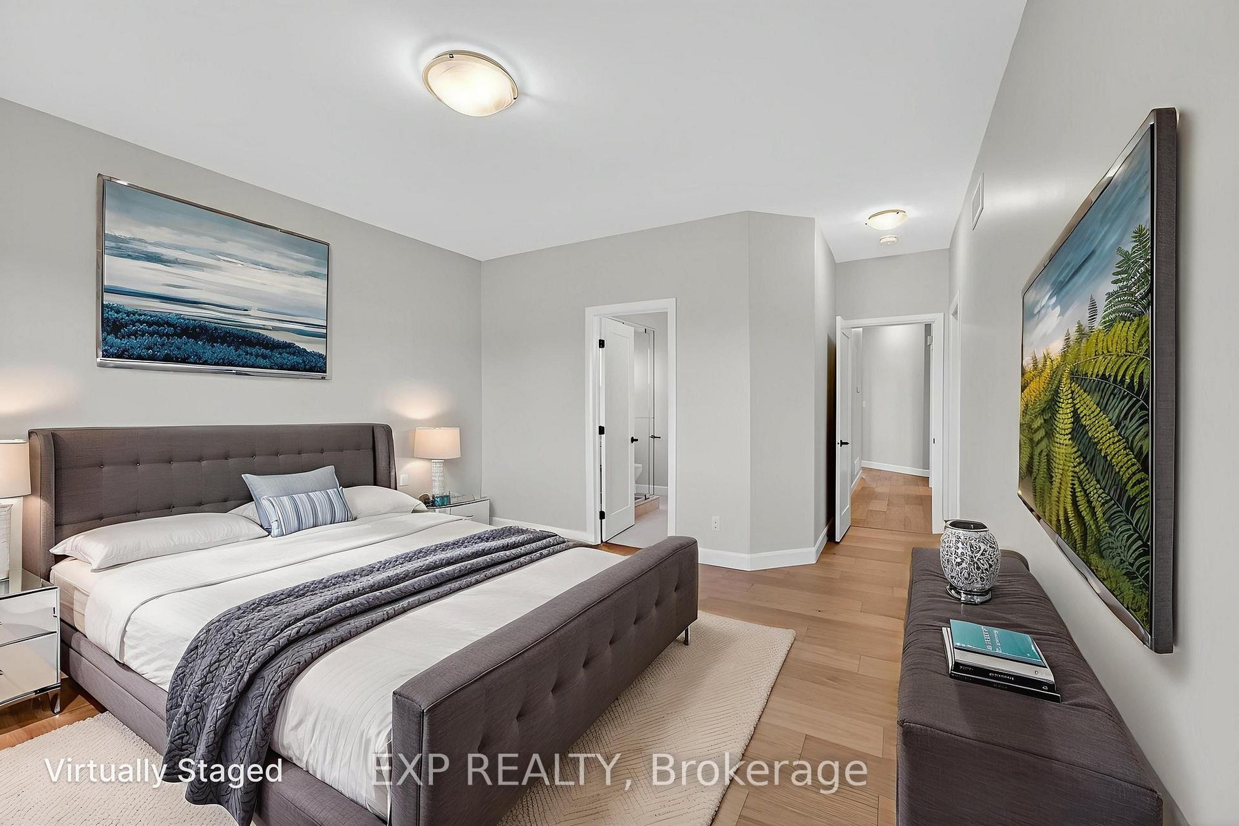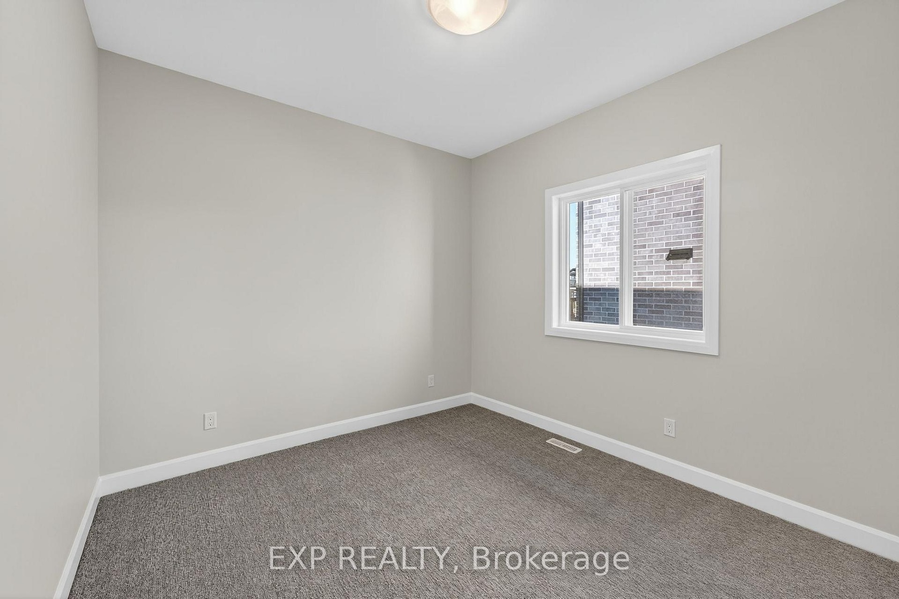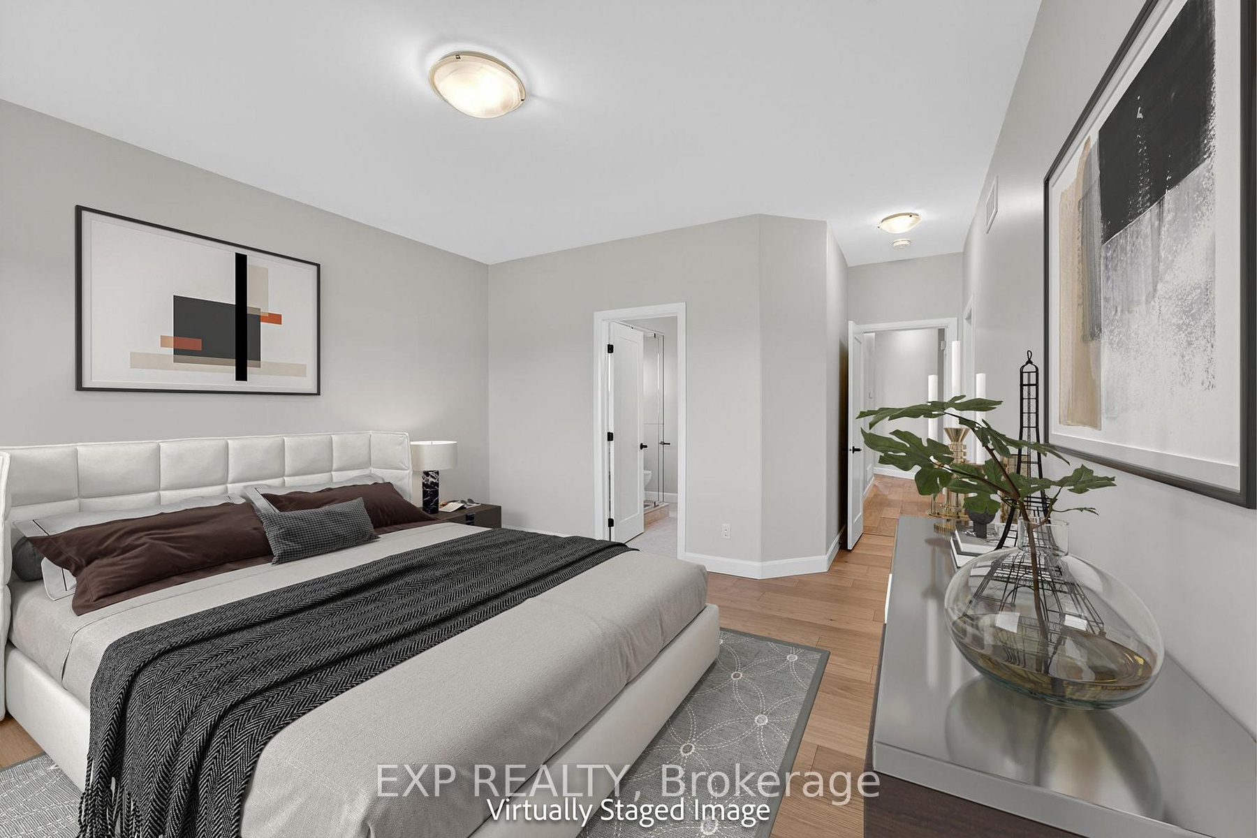 Move-in ready and FULLY FINISHED! This 5 bedroom, 3 bathroom Quinte model all brick bungalow by Duvanco Homes sits on a PREMIUM lot on cul-de-sac backing onto green space, offering privacy and peaceful views. Designed with modern living in mind, the open-concept layout features a custom quality kitchen with oversized island, coffered ceiling in the living room and distressed wide plank hardwood throughout the main floor. Modern light fixtures and finishes throughout. The primary suite includes a walk-in closet and luxurious ensuite with double vanity and glass-surround porcelain tile shower. Main floor laundry with access to the attached garage. Lower level finished with 2 bedrooms, 4pc bathroom and recreation room. Exterior landscaping complete with paved driveway, fully sodded yard, garden package and stone walkway. Completed pressure treated deck with black ballisters. This Quinte model home is Holmes Approved. Settlers Ridge Subdivision offers trails, park, asphalt paved sidewalks, green space and is just minutes to all amenities.