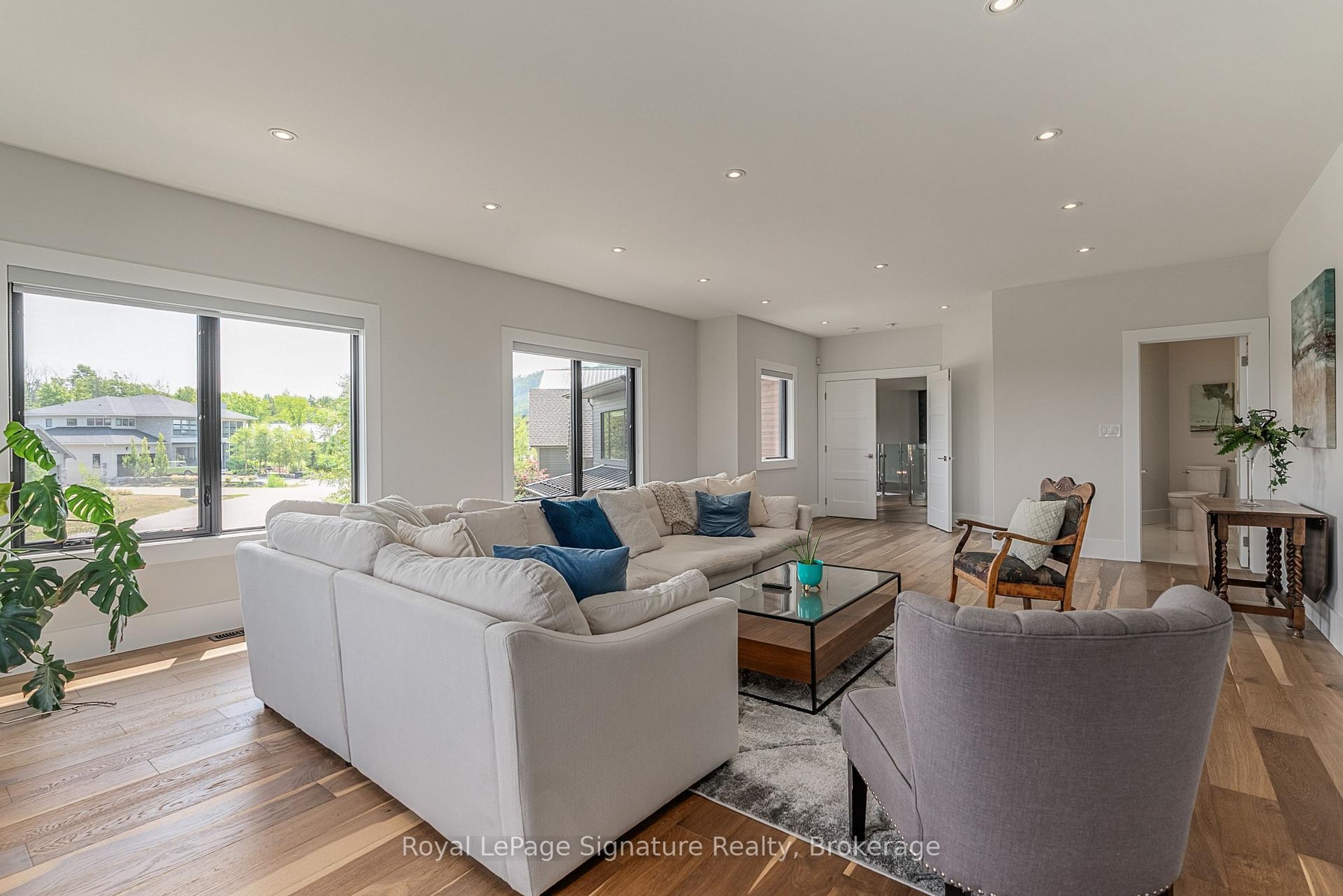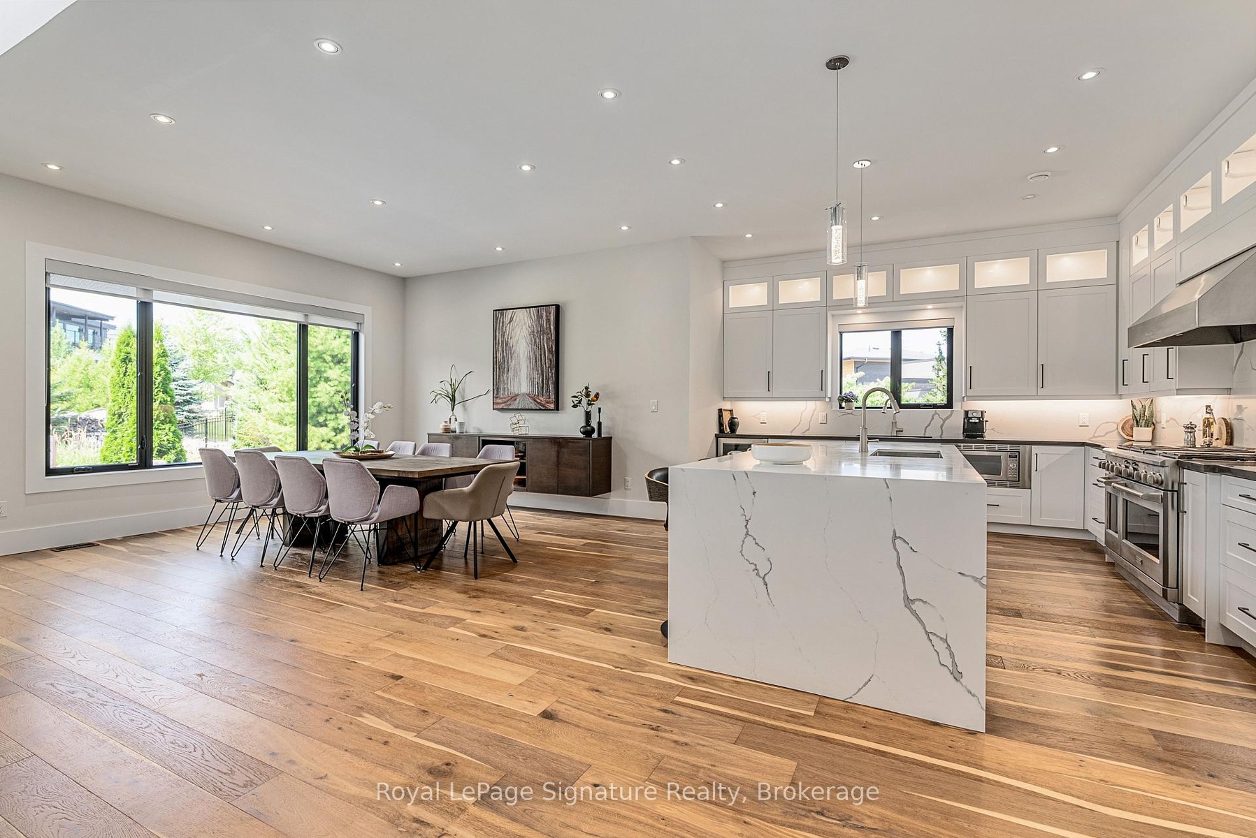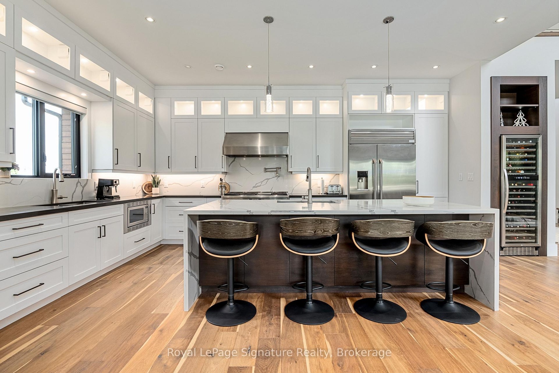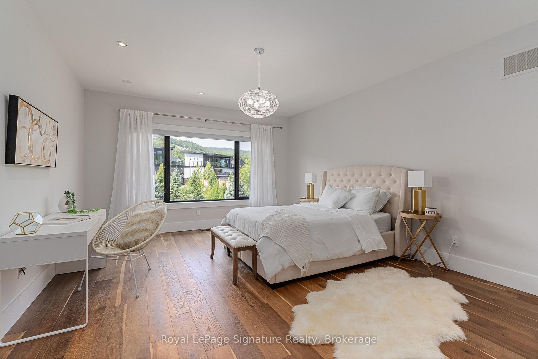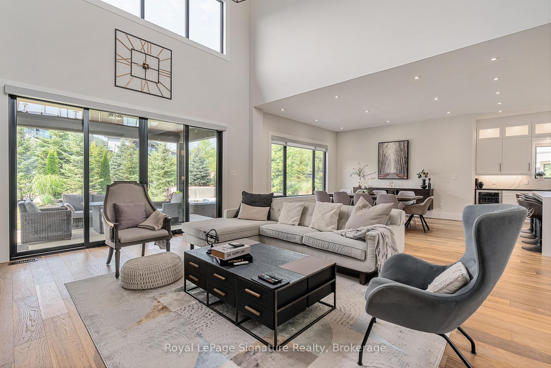 This custom-built home in the Nipissing Ridge community offers luxury mountain living at the base of Alpine Ski Club and Craigleith. Steps from skiing, hiking, and the shores of Georgian Bay, and minutes to the boutiques, restaurants, and golf courses of The Blue Mountains, it blends year-round recreation with upscale comfort. The 20-foot ceiling great room features expansive windows framing mountain views and a 48-inch linear gas fireplace. The chef's kitchen is equipped with a quartz waterfall island, prep area, beverage station, and premium appliances including a 48-inch Monogram gas range and fridge, Miele dishwasher, wine cooler, and beverage fridge. The main floor primary suite provides a private retreat with a floating vanity, double sinks, glass-enclosed double shower, freestanding tub, heated floors, and a custom dressing room. Engineered hardwood floors, a pre-wired sound system, and a dedicated office enhance everyday living. Upstairs offers a family/games room and three bedrooms, each with an ensuite. The finished lower level includes a family room, games area, two bedrooms, additional bathrooms, in-floor heating, and durable vinyl flooring. Exterior features include stone and wood finishes, an 8-foot glass-paneled entry door, and 9x9 garage doors with a lift system. Move-in ready, this is a rare opportunity to enjoy an active, four-season lifestyle in one of the areas most sought-after communities.