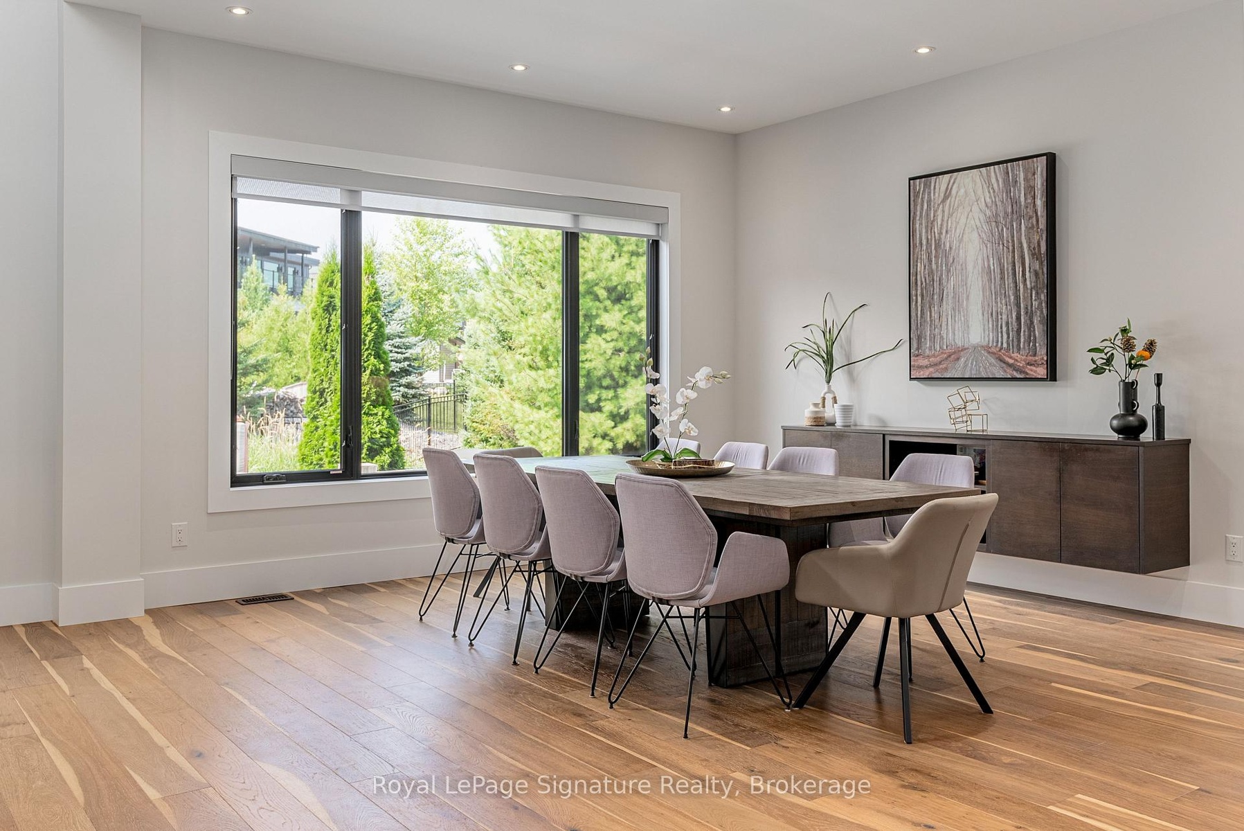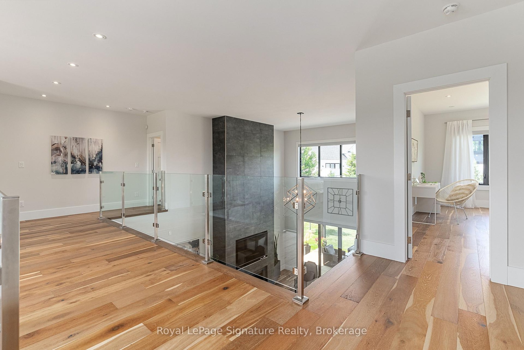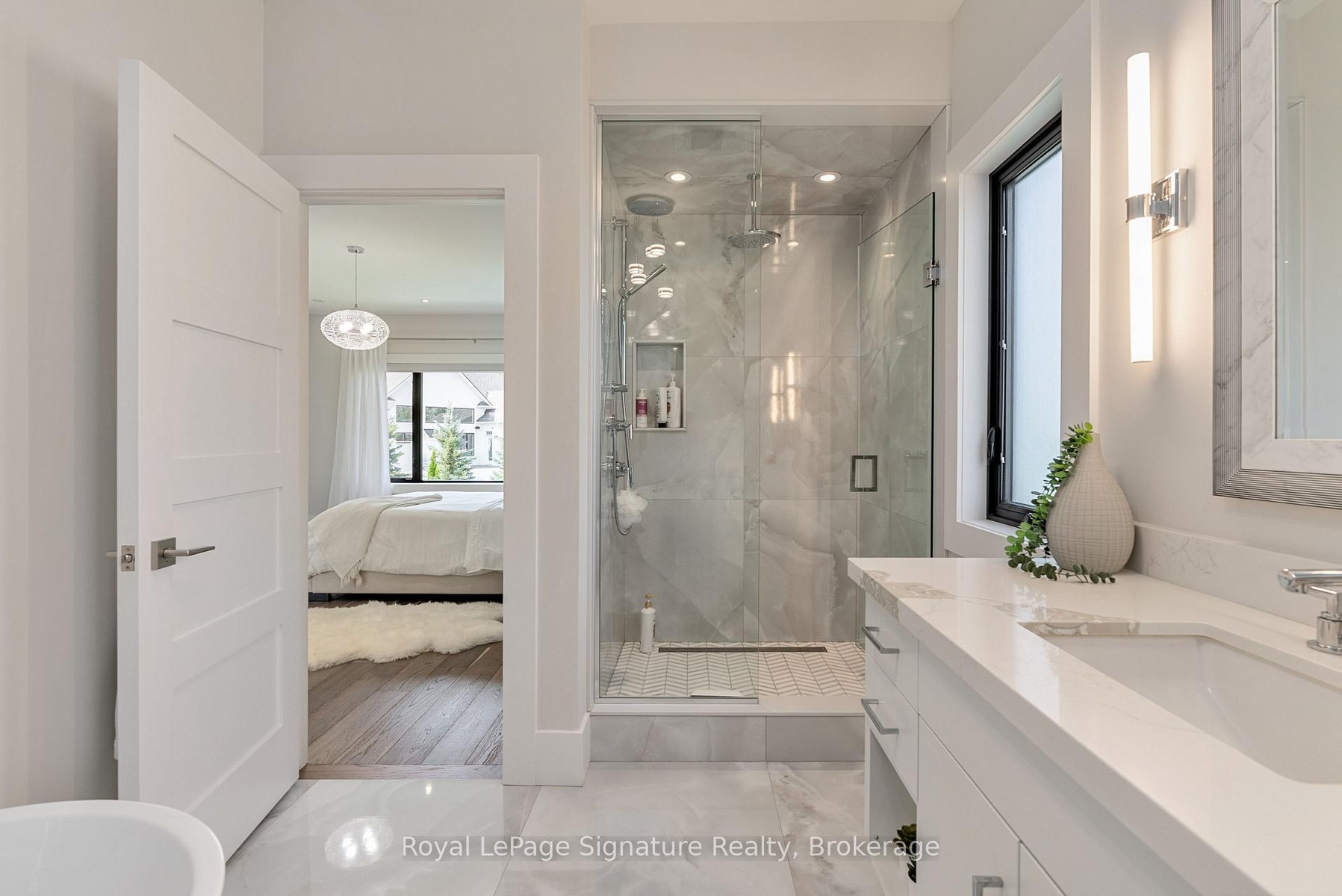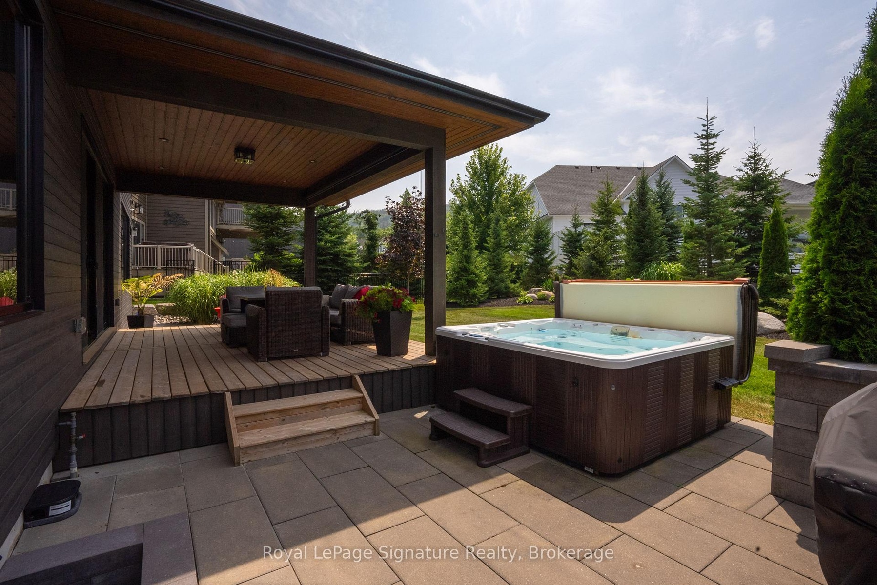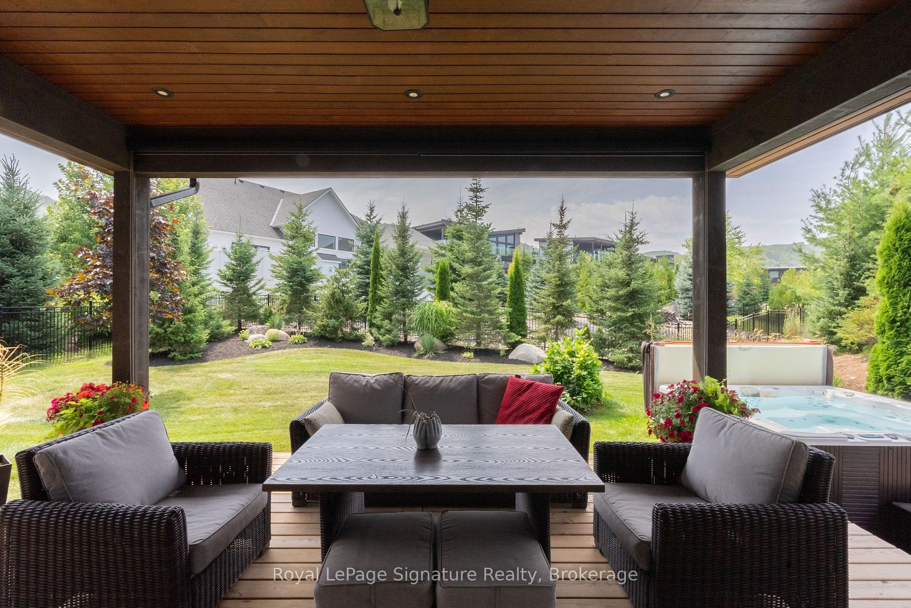 This custom-built home in the Nipissing Ridge community offers luxury mountain living at the base of Alpine Ski Club and Craigleith. Steps from skiing, hiking, and the shores of Georgian Bay, and minutes to the boutiques, restaurants, and golf courses of The Blue Mountains, it blends year-round recreation with upscale comfort. The 20-foot ceiling great room features expansive windows framing mountain views and a 48-inch linear gas fireplace. The chef's kitchen is equipped with a quartz waterfall island, prep area, beverage station, and premium appliances including a 48-inch Monogram gas range and fridge, Miele dishwasher, wine cooler, and beverage fridge. The main floor primary suite provides a private retreat with a floating vanity, double sinks, glass-enclosed double shower, freestanding tub, heated floors, and a custom dressing room. Engineered hardwood floors, a pre-wired sound system, and a dedicated office enhance everyday living. Upstairs offers a family/games room and three bedrooms, each with an ensuite. The finished lower level includes a family room, games area, two bedrooms, additional bathrooms, in-floor heating, and durable vinyl flooring. Exterior features include stone and wood finishes, an 8-foot glass-paneled entry door, and 9x9 garage doors with a lift system. Move-in ready, this is a rare opportunity to enjoy an active, four-season lifestyle in one of the areas most sought-after communities.