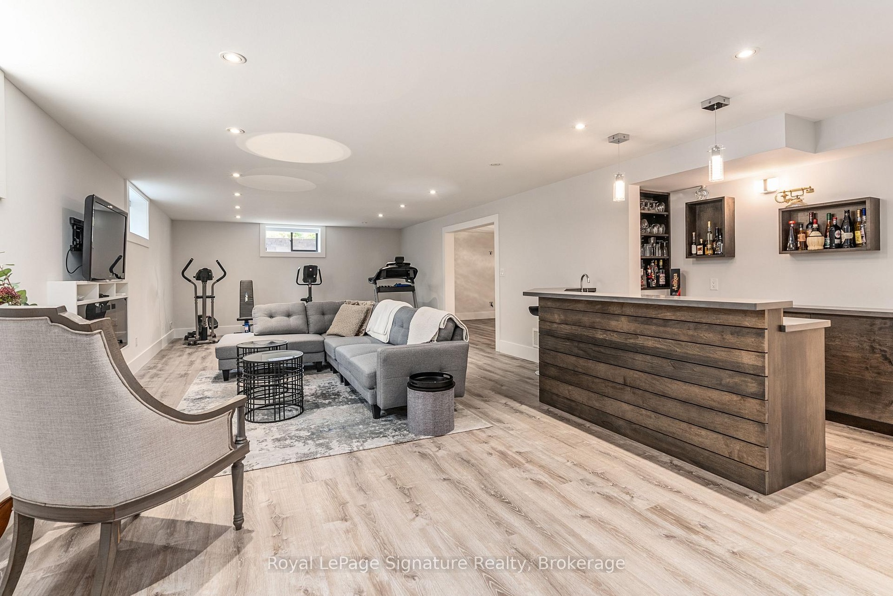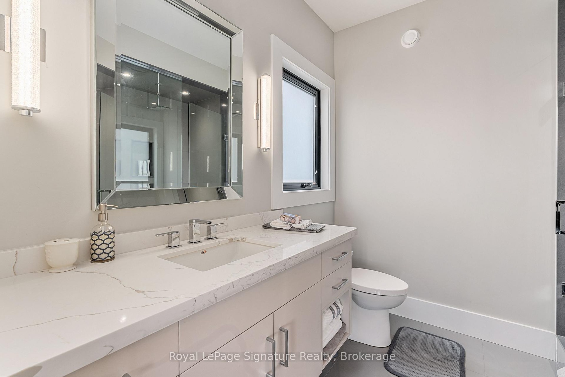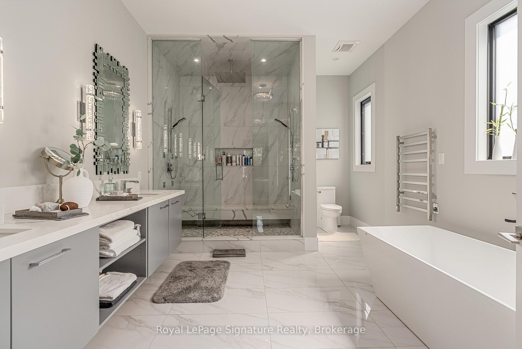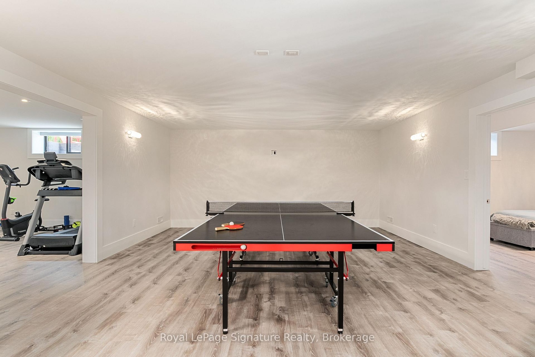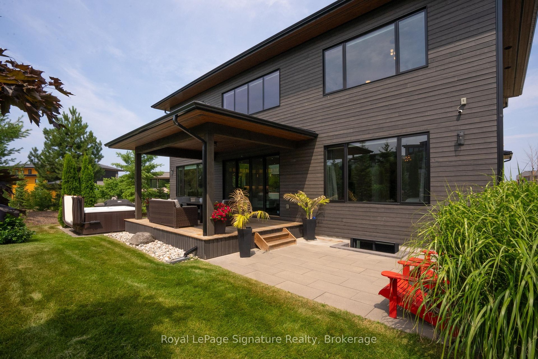 This custom-built home in the Nipissing Ridge community offers luxury mountain living at the base of Alpine Ski Club and Craigleith. Steps from skiing, hiking, and the shores of Georgian Bay, and minutes to the boutiques, restaurants, and golf courses of The Blue Mountains, it blends year-round recreation with upscale comfort. The 20-foot ceiling great room features expansive windows framing mountain views and a 48-inch linear gas fireplace. The chef's kitchen is equipped with a quartz waterfall island, prep area, beverage station, and premium appliances including a 48-inch Monogram gas range and fridge, Miele dishwasher, wine cooler, and beverage fridge. The main floor primary suite provides a private retreat with a floating vanity, double sinks, glass-enclosed double shower, freestanding tub, heated floors, and a custom dressing room. Engineered hardwood floors, a pre-wired sound system, and a dedicated office enhance everyday living. Upstairs offers a family/games room and three bedrooms, each with an ensuite. The finished lower level includes a family room, games area, two bedrooms, additional bathrooms, in-floor heating, and durable vinyl flooring. Exterior features include stone and wood finishes, an 8-foot glass-paneled entry door, and 9x9 garage doors with a lift system. Move-in ready, this is a rare opportunity to enjoy an active, four-season lifestyle in one of the areas most sought-after communities.
