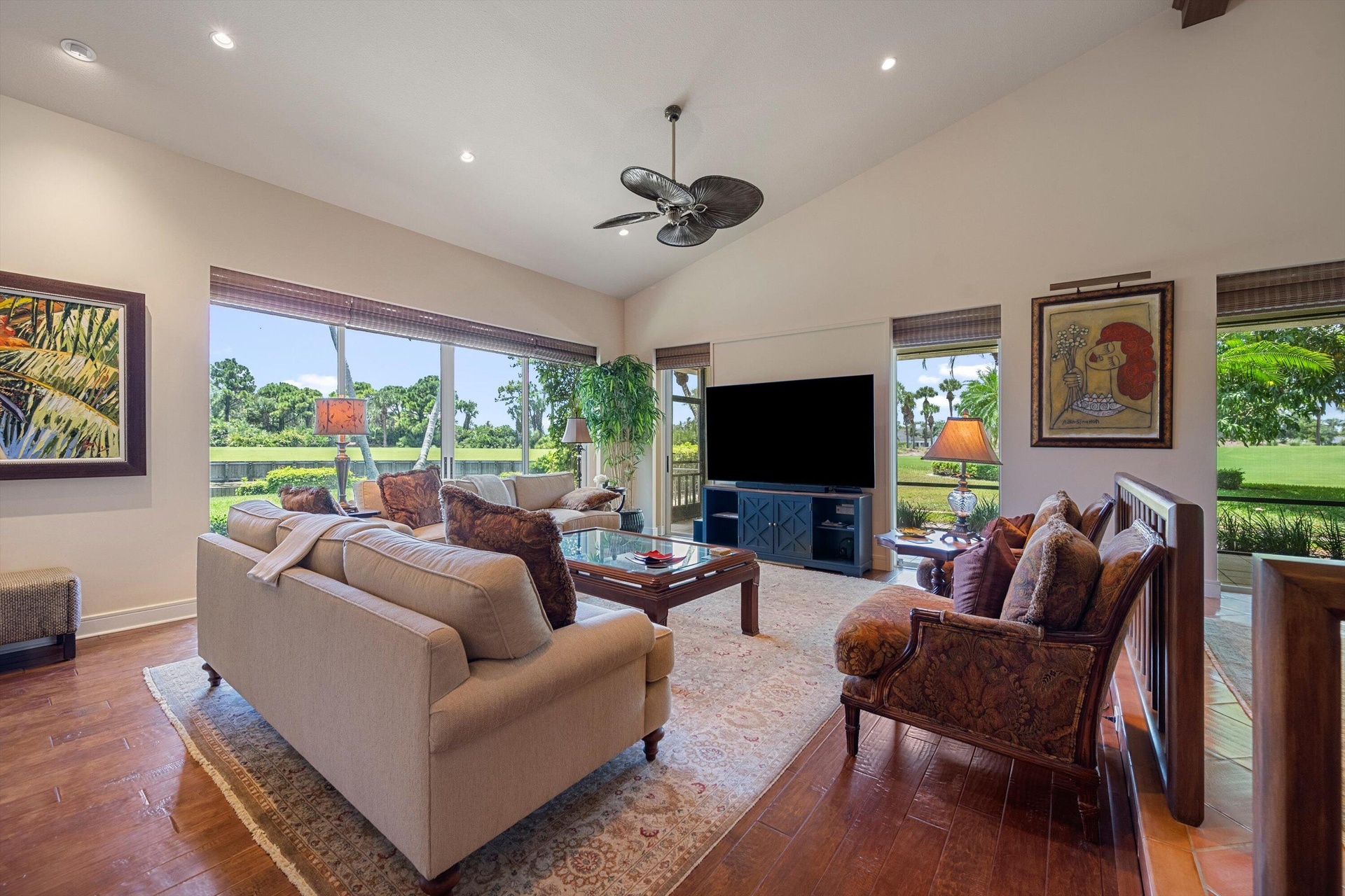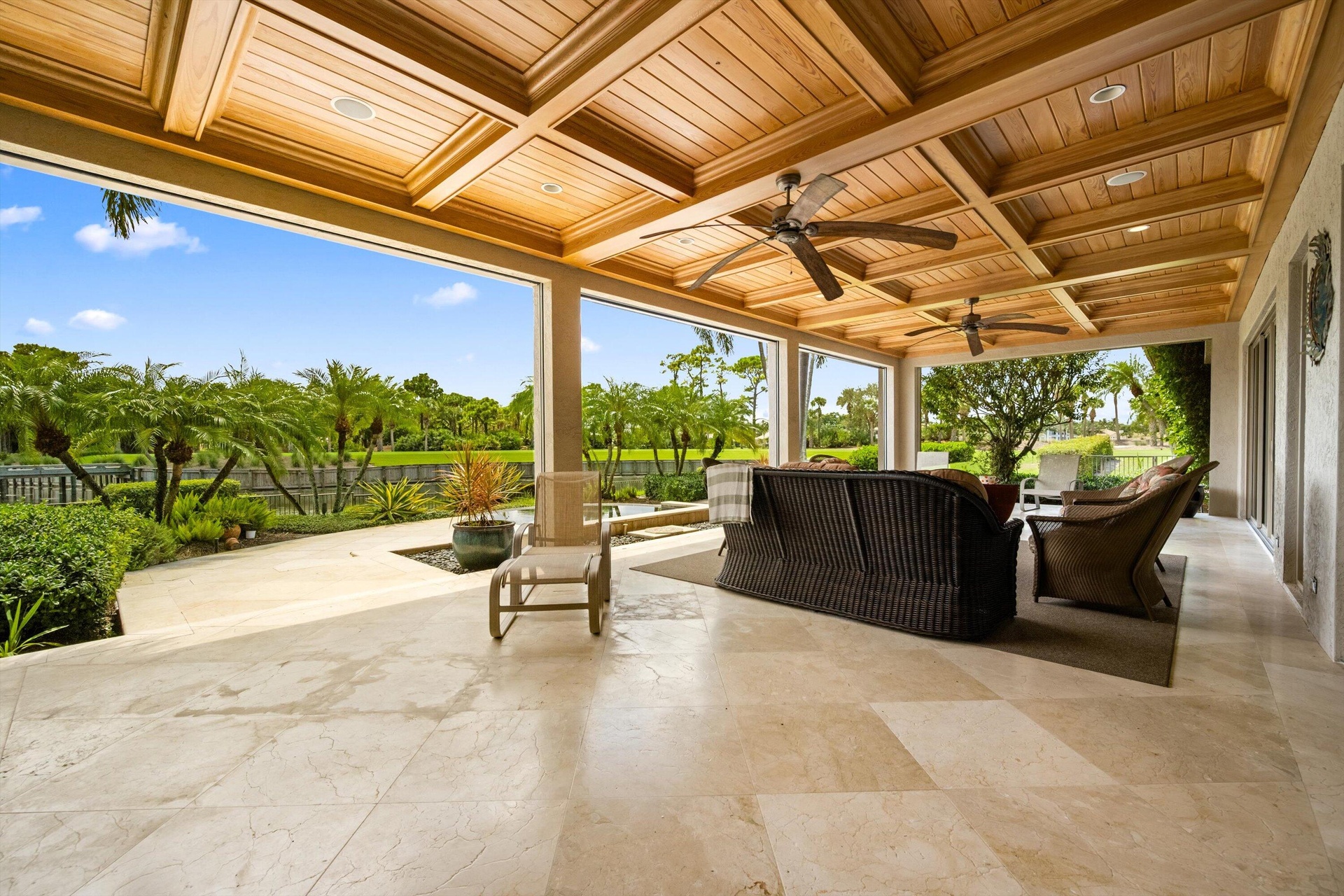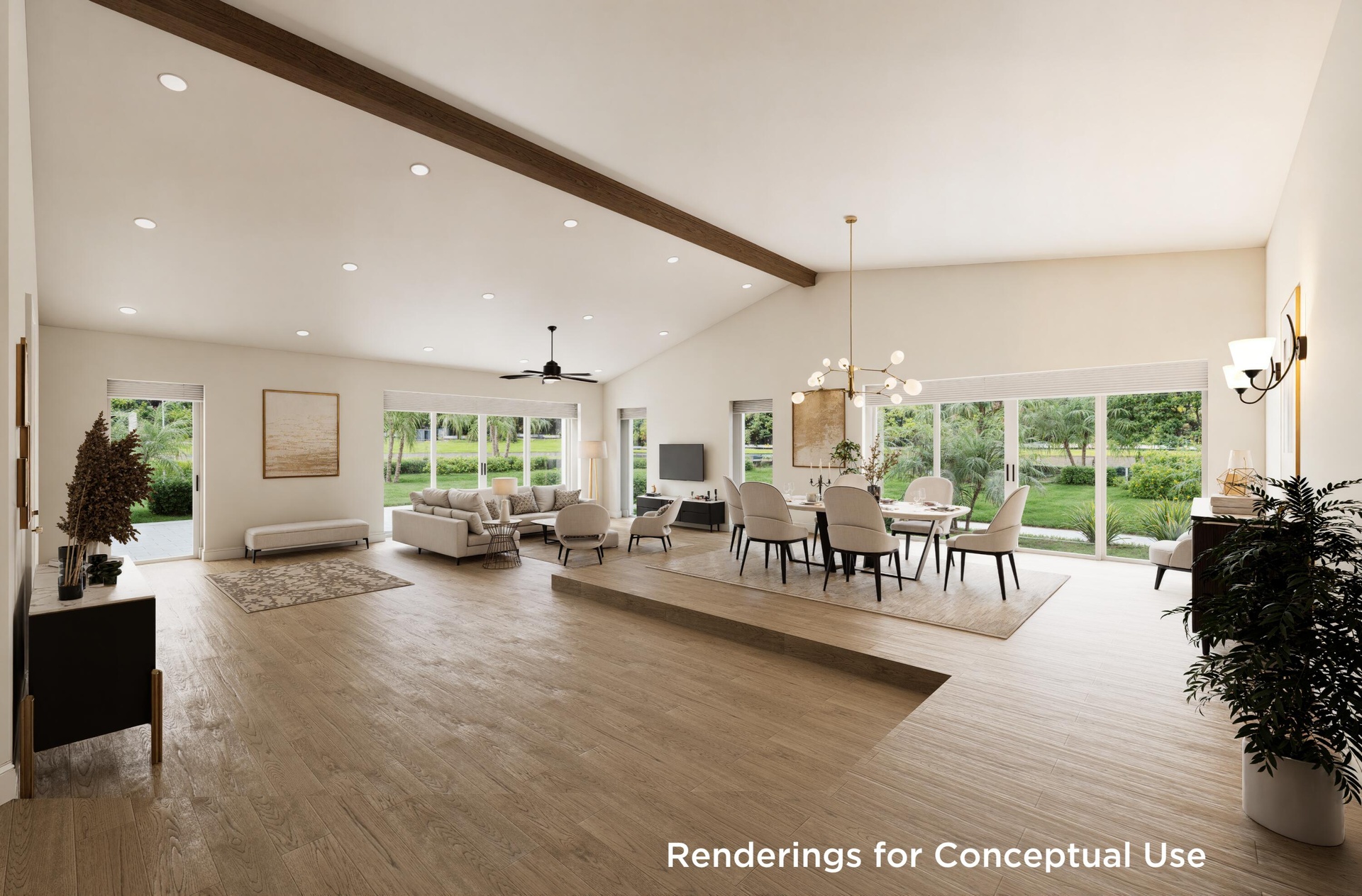 Welcome to 142 Terrapin Trail, an extraordinary residence offering 3,713 square feet, 3 bedrooms, and 3 full bathrooms in the heart of The Loxahatchee Club. Situated at the end of a cul-de-sac on undeniably the premier double lot in the community, this home boasts panoramic vistas that redefine luxury living. Step inside through a grand entrance to soaring ceilings and expansive windows designed to capture the breathtaking views of the Signature Jack Nicklaus designed golf course and lake. The formal living and dining room serves as the home's centerpiece, showcasing a striking architectural beam, dramatic ceiling height, and sweeping views.