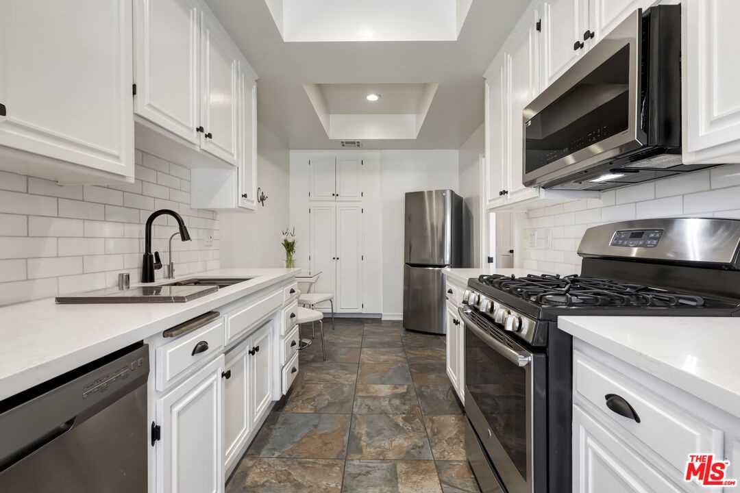 Tucked away in a quiet, rear-facing position in a secure building near South Beverly Hills, this beautifully upgraded residence in Pico-Robertson offers privacy, scale, and sophisticated living. An expansive formal entry introduces a refined interior featuring wide-plank luxury vinyl flooring with acoustic underlay, restored oak cabinetry, crown molding, and smart-home features including a DoorBird intercom, Ring doorbell, and mobile-accessible building cameras.The sunlit living room is anchored by a limestone fireplace with matte black accents and flows seamlessly into the dining area, which enjoys skyline and sunrise views. The chef's kitchen has been reimagined with quartz countertops, soft-close drawers, porcelain tile floors, top-tier appliances, a Ruvati sink with Moen faucet, water filtration system, and two oversized pantriesincluding one large enough to accommodate a 48" refrigerator. A mirrored wet bar with matching finishes enhances the home's entertainment appeal.The primary suite spans over 400 square feet with two large walk-in closets and tranquil bamboo views. Its spa-like bath includes an 8-foot quartz vanity, Jacuzzi-style soaking tub, rainfall shower with new doors and hardware, matte black finishes, and extensive storage. The guest bedroom features custom built-ins and a full closet, while the adjacent bath offers a deep soaking tub, rain shower, and power flush toilet.Additional highlights include a fully serviced HVAC system, all new plumbing shut-off valves, rewired electrical, full-size washer and serviced dryer, and custom mini blinds throughout. The unit includes two non-tandem parking spacesone EV-compatibleand convenient guest parking. Spectrum internet, hardwired Ethernet, and landline jacks are available.Set in a prime location with every detail considered, this residence blends comfort, technology, and classic design in one of LA's most desirable neighborhoods.