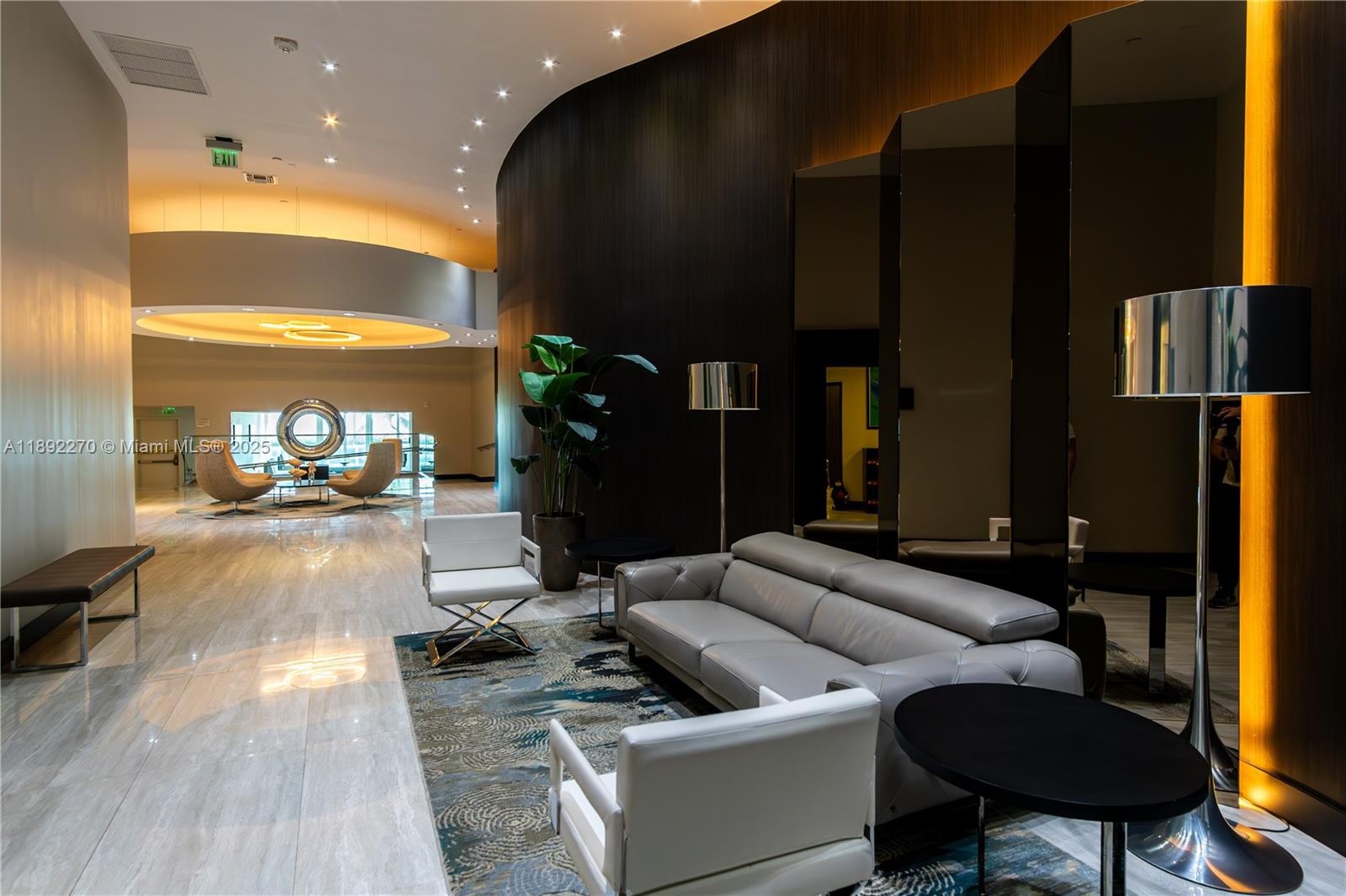 The grand entry opens to a light-filled living and dining expanse framed by floor-to-ceiling glass. A wrap-around balcony offers immersive ocean views from every angle. This level features a sophisticated junior suite with a private bath and balcony access, a second designer bedroom, a powder room, and a gourmet kitchen nook. Every inch has been professionally curated with high-end finishes for a turnkey transition.