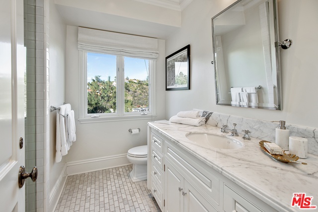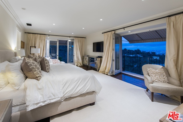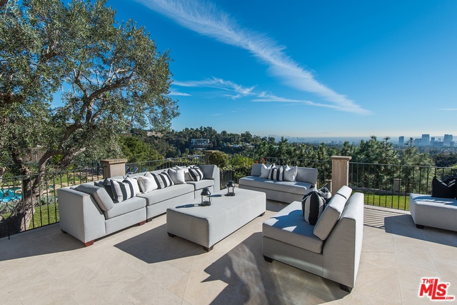 This gated French Country Maison offers 4 bedrooms, 2 staff quarters, 9 baths and gorgeous city views. A long private driveway framed by mature olive trees, white roses & lavender leads to a large motor court. 2-story entry, library, coffered ceilings, and French doors overlook the courtyard. Formal living rm w/views from downtown to Century City on approximately 2 acres. California indoor/outdoor lifestyle w/spacious dining room, gourmet chef's kitchen & breakfast area w/ family room. Lovely verandas, terraces, outdoor BBQ w/fireplace, salt water pool and a pergola. The luxurious primary suite has 2 separate baths & 2 walk-in closets. Open media room, game room, service kitchen, N/S championship Tennis Court, gym, sauna & attached 3-car garage.
