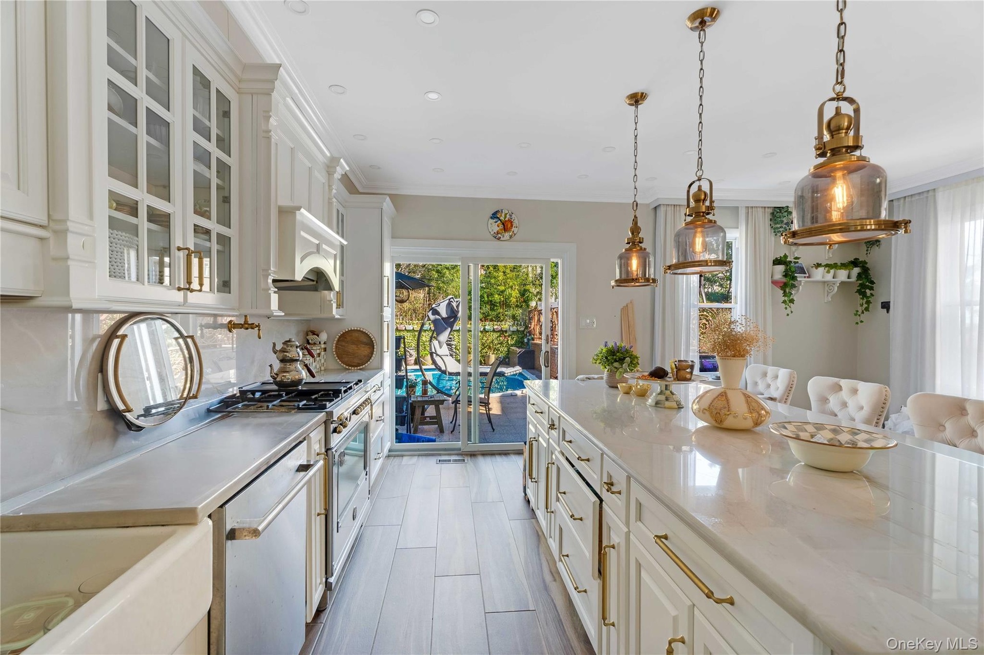 - Kitchen with white cabinets, hanging light fixtures, glass insert cabinets, light stone counters, and stainless steel appliances