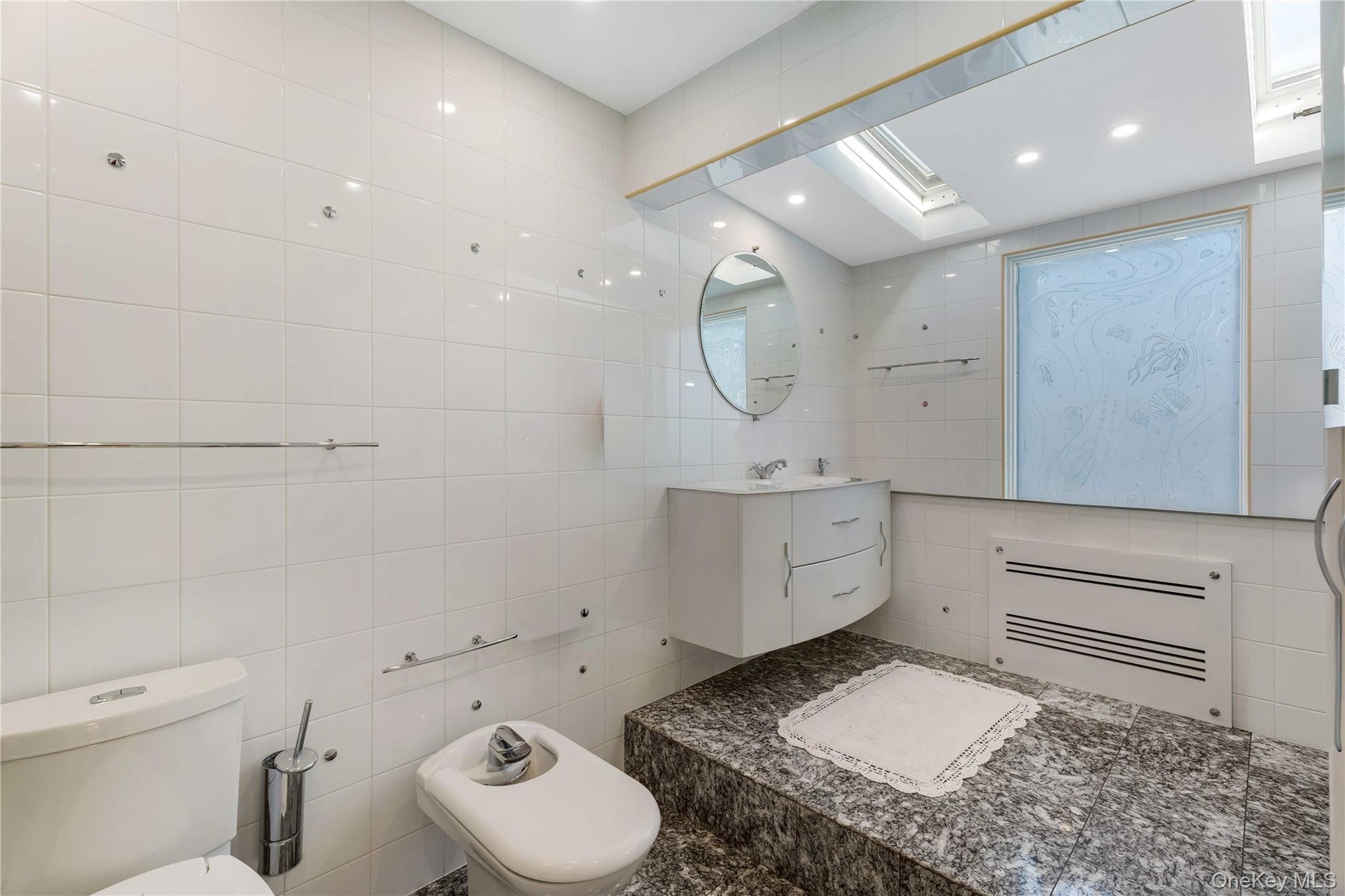 - Bathroom featuring tile walls, vanity, radiator heating unit, a skylight, and a bidet