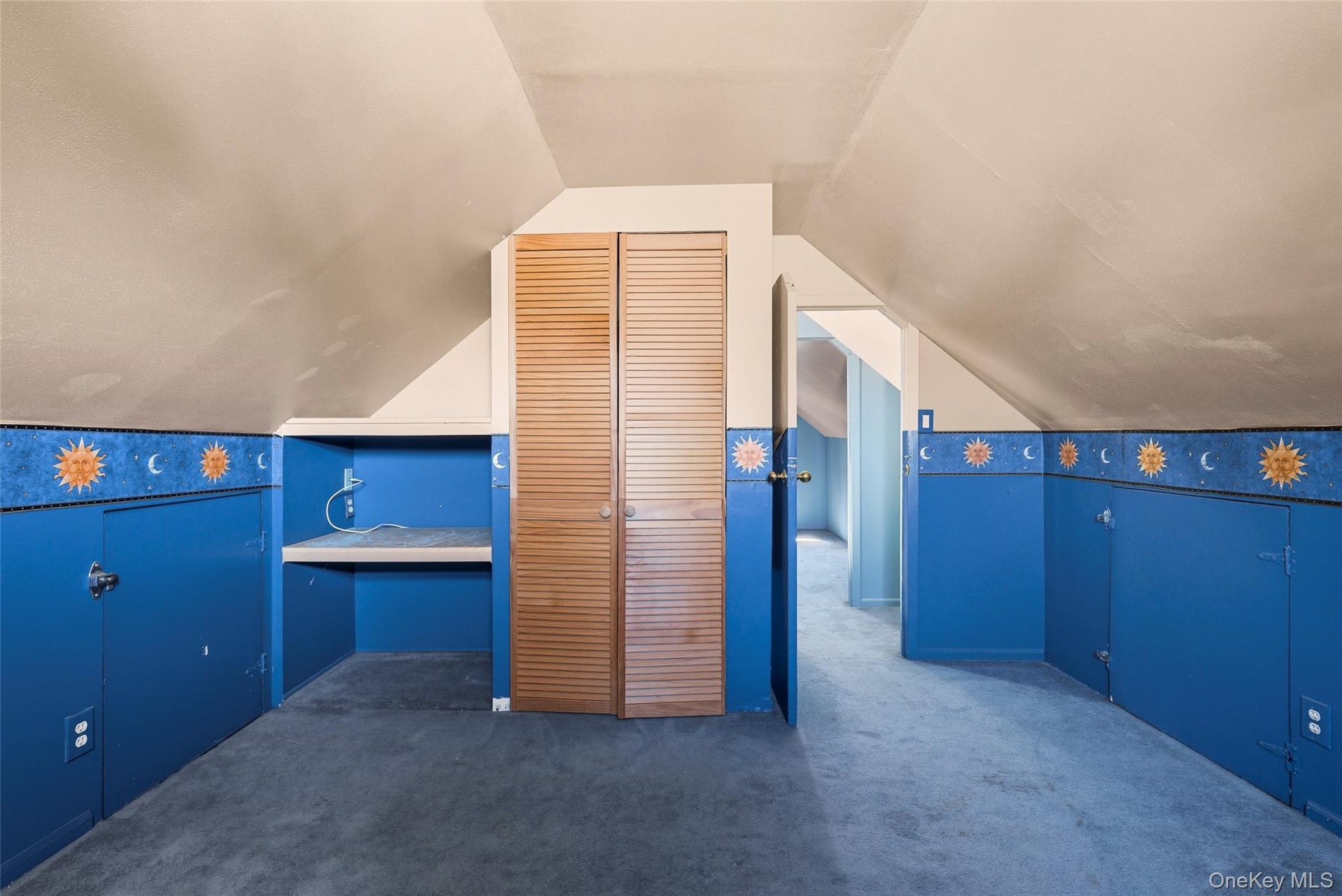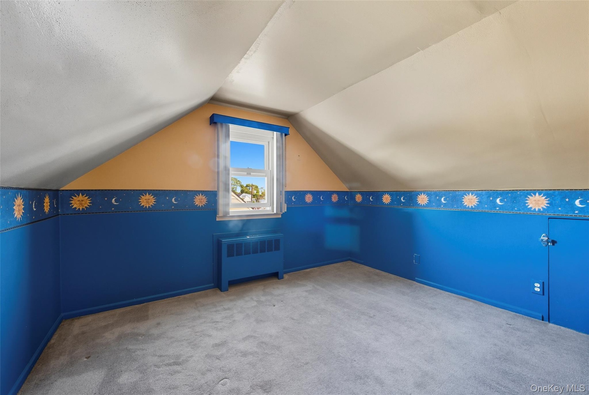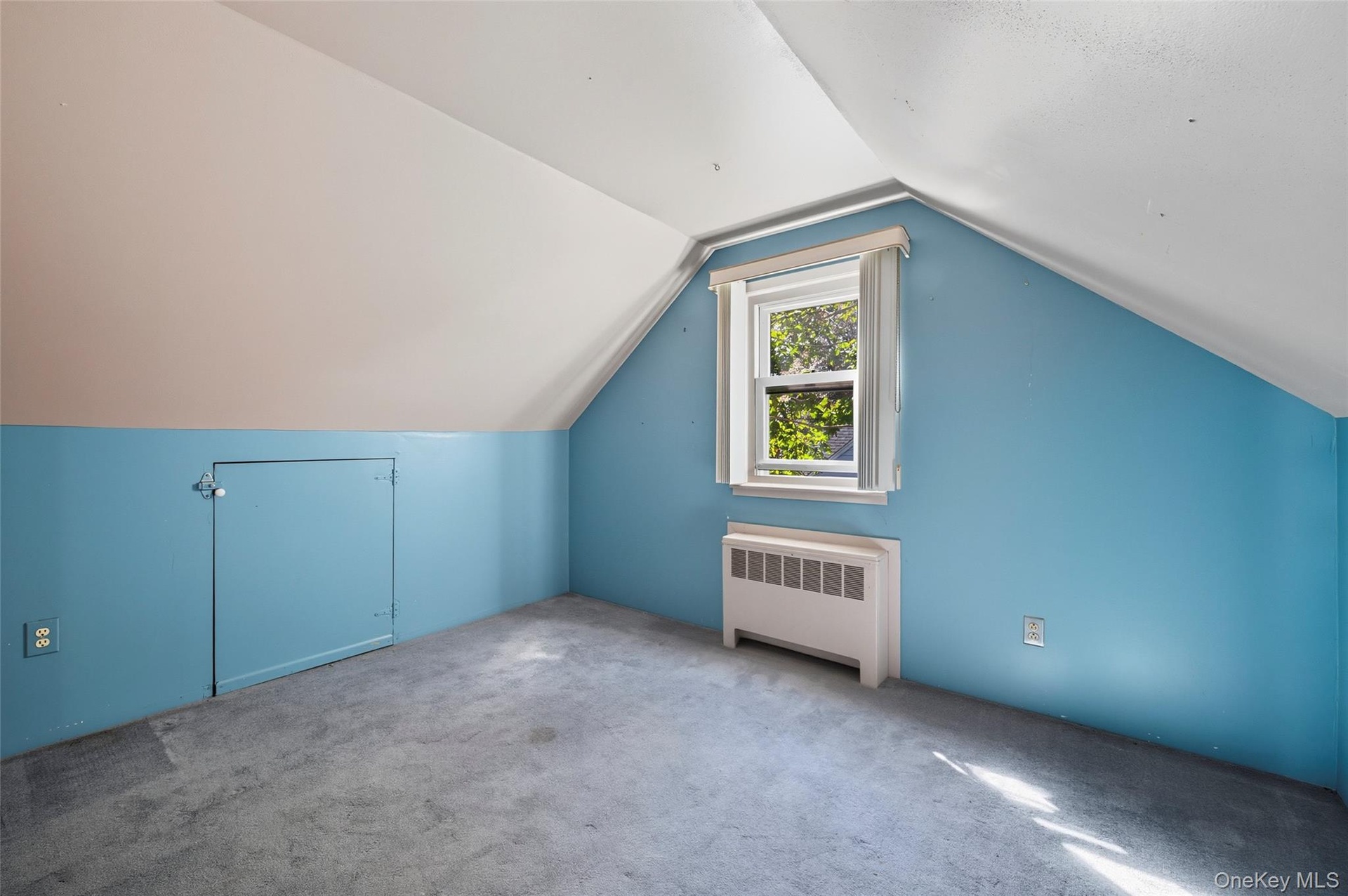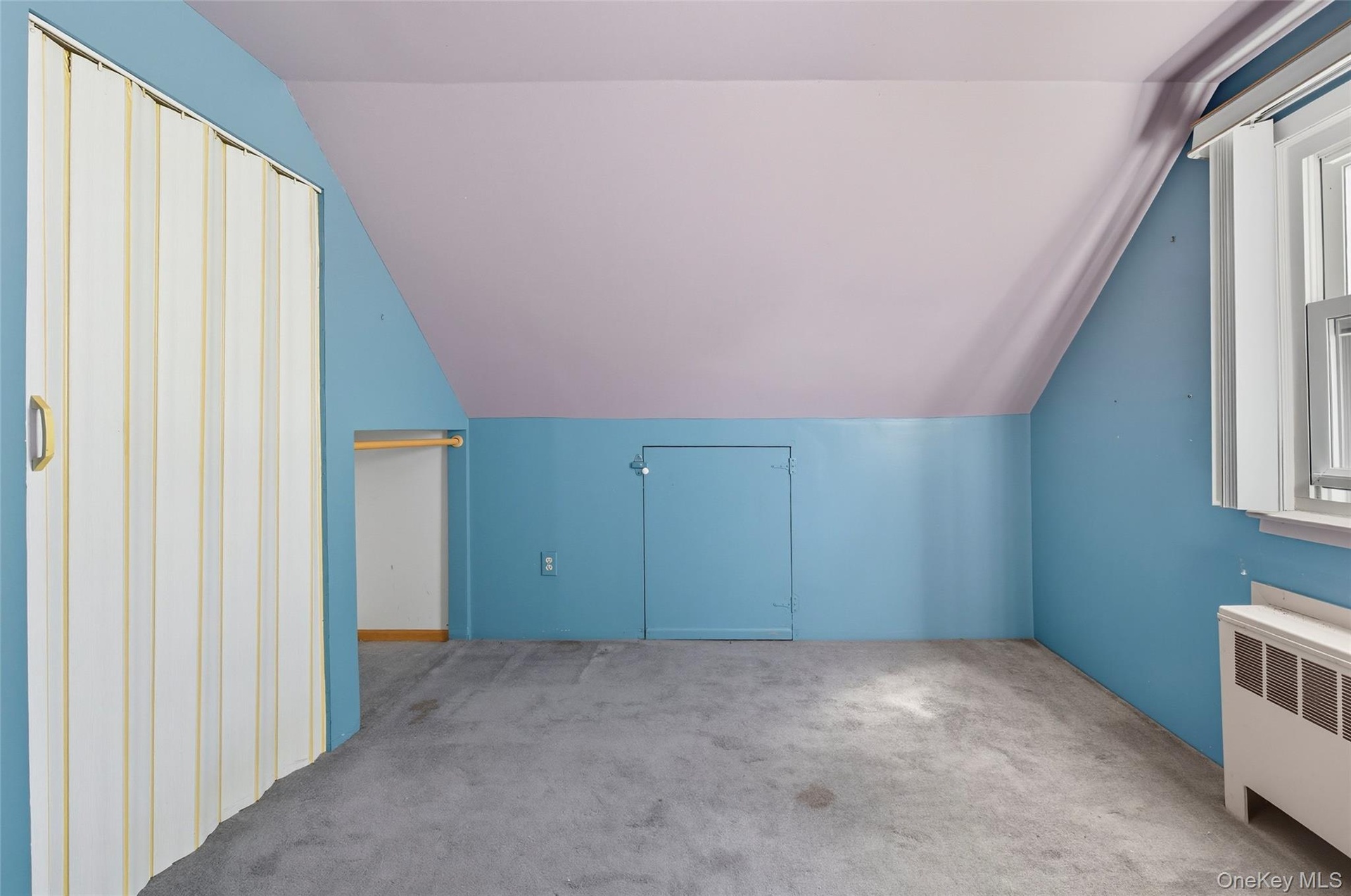 - Additional living space with radiator, carpet floors, and lofted ceiling