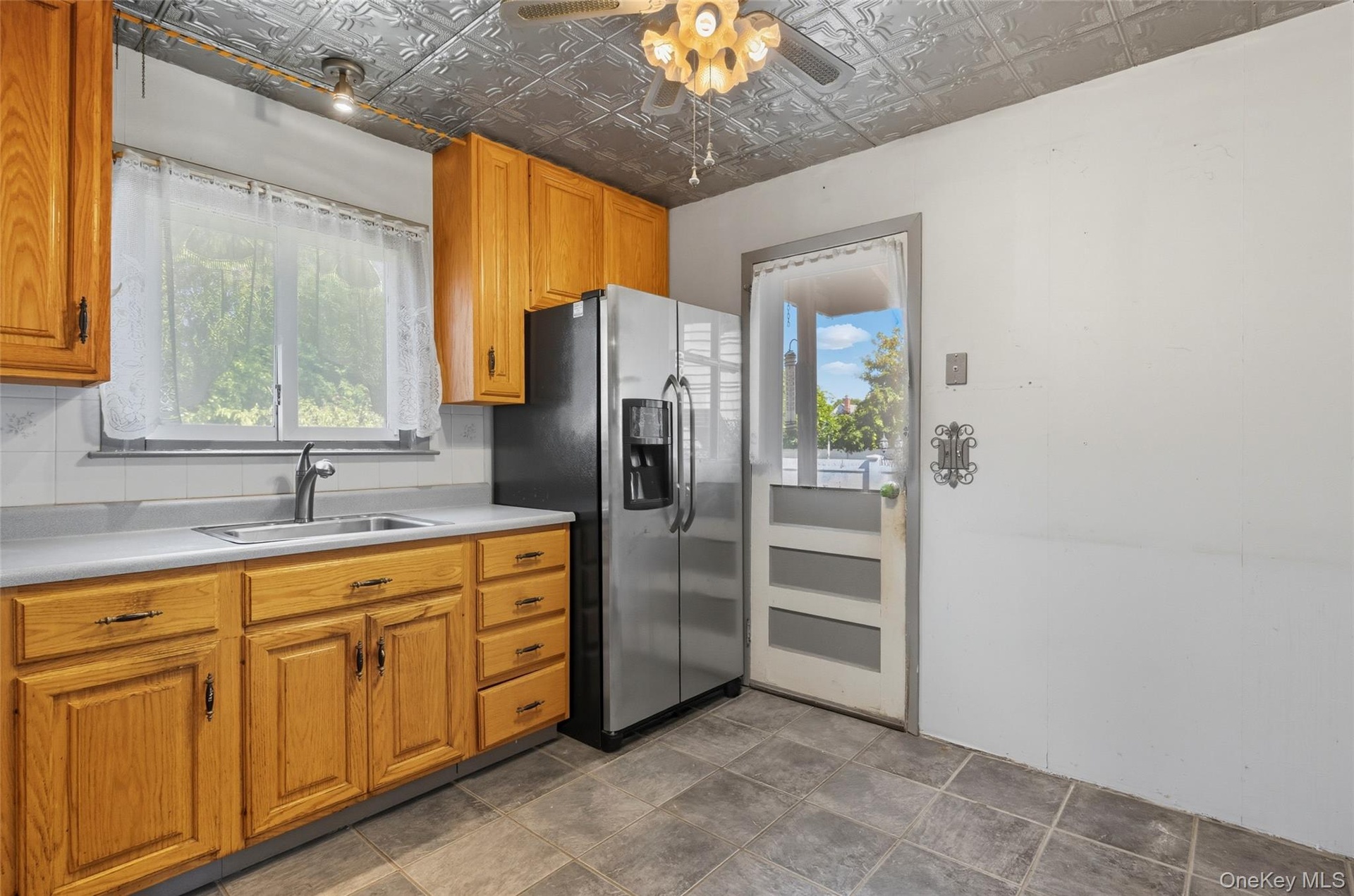 - Kitchen with stainless steel fridge, light countertops, brown cabinetry, and ceiling fan