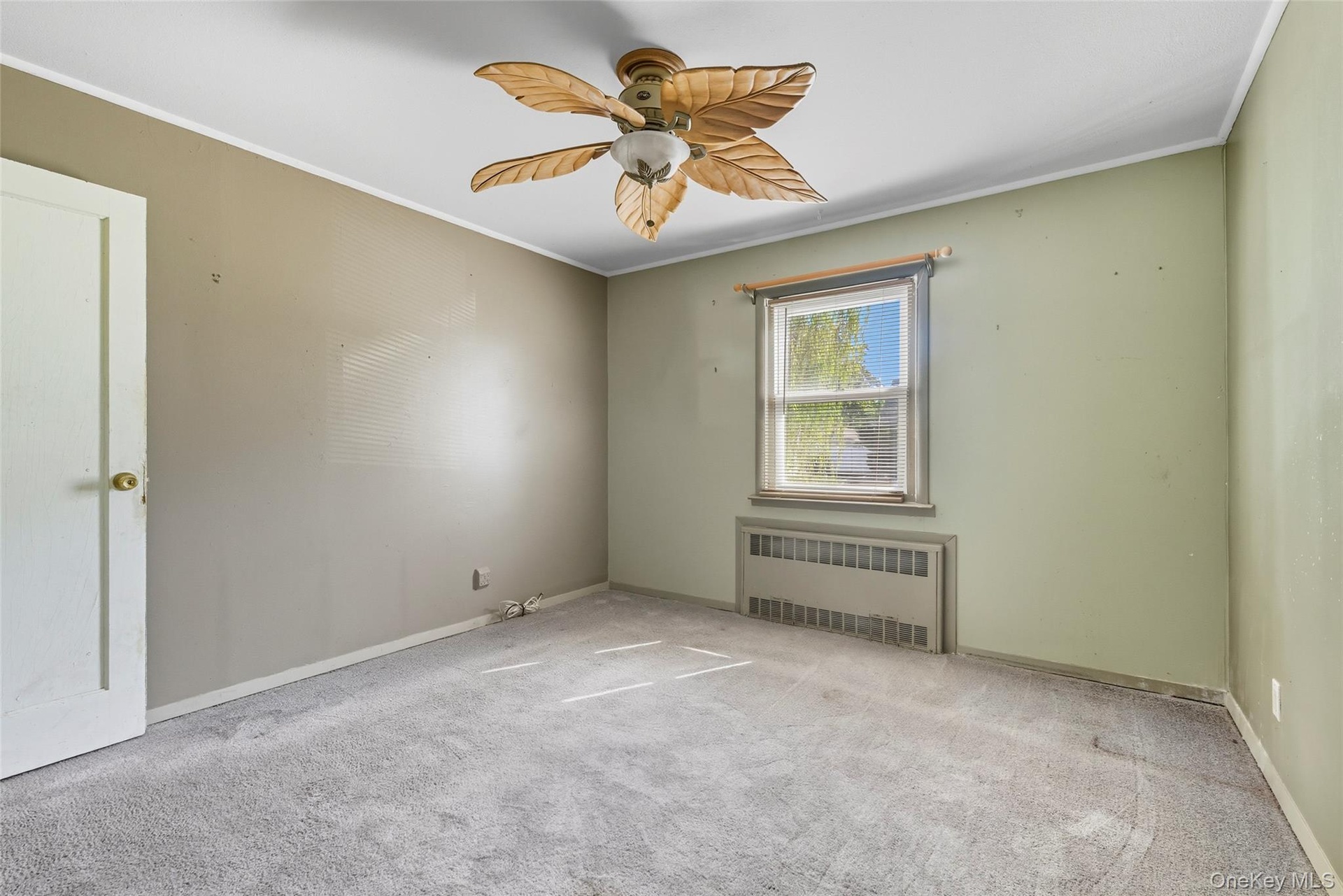 - Empty room with ornamental molding, radiator, carpet floors, and ceiling fan