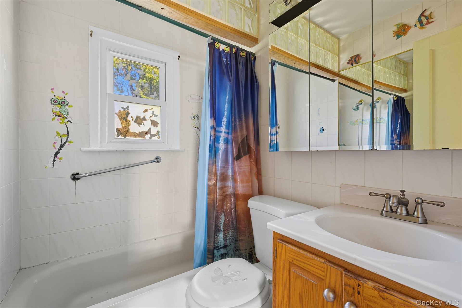 - Bathroom with vanity, tile walls, shower / tub combo with curtain, and tasteful backsplash