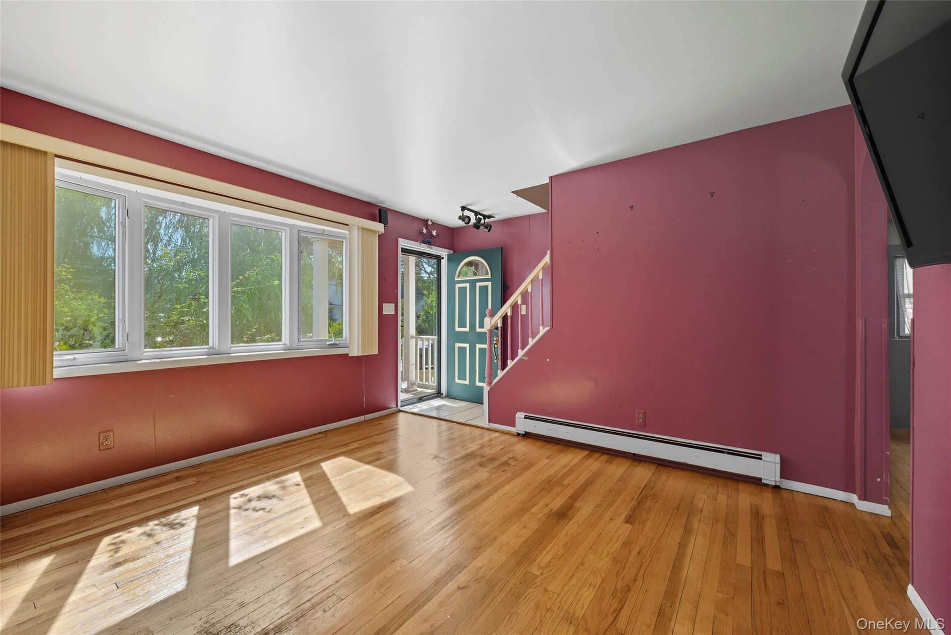 - Entryway featuring baseboard heating, light wood-type flooring, and stairway