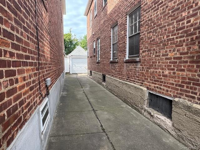 - View of home's exterior with a detached garage, brick siding, an outbuilding, and driveway