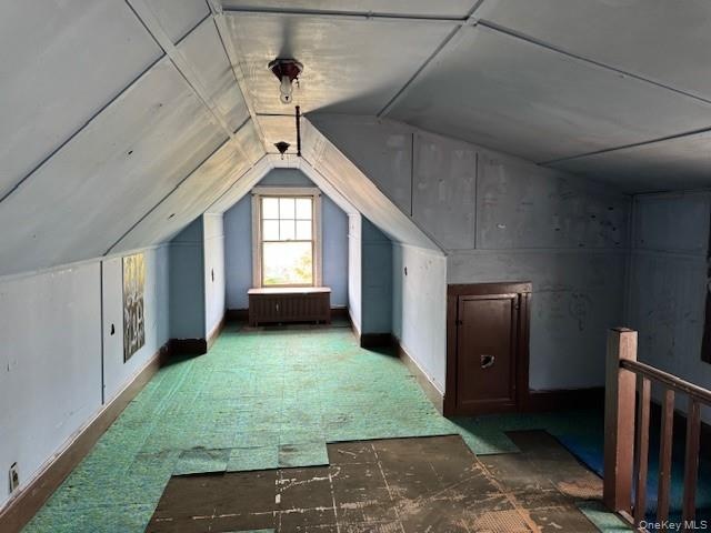 - Empty room featuring wood walls, dark wood finished floors, and radiator heating unit
