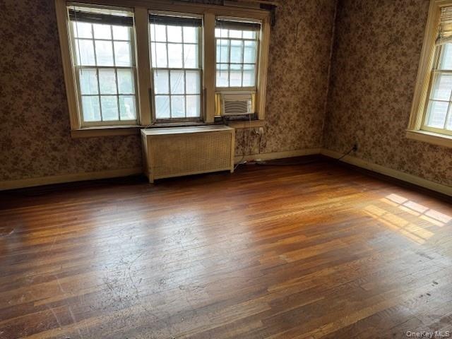 - Spare room with dark wood-style flooring, wallpapered walls, and radiator