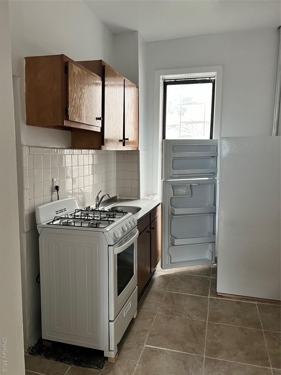 - Kitchen featuring stove, tasteful backsplash, light countertops, white fridge, and dark brown cabinets