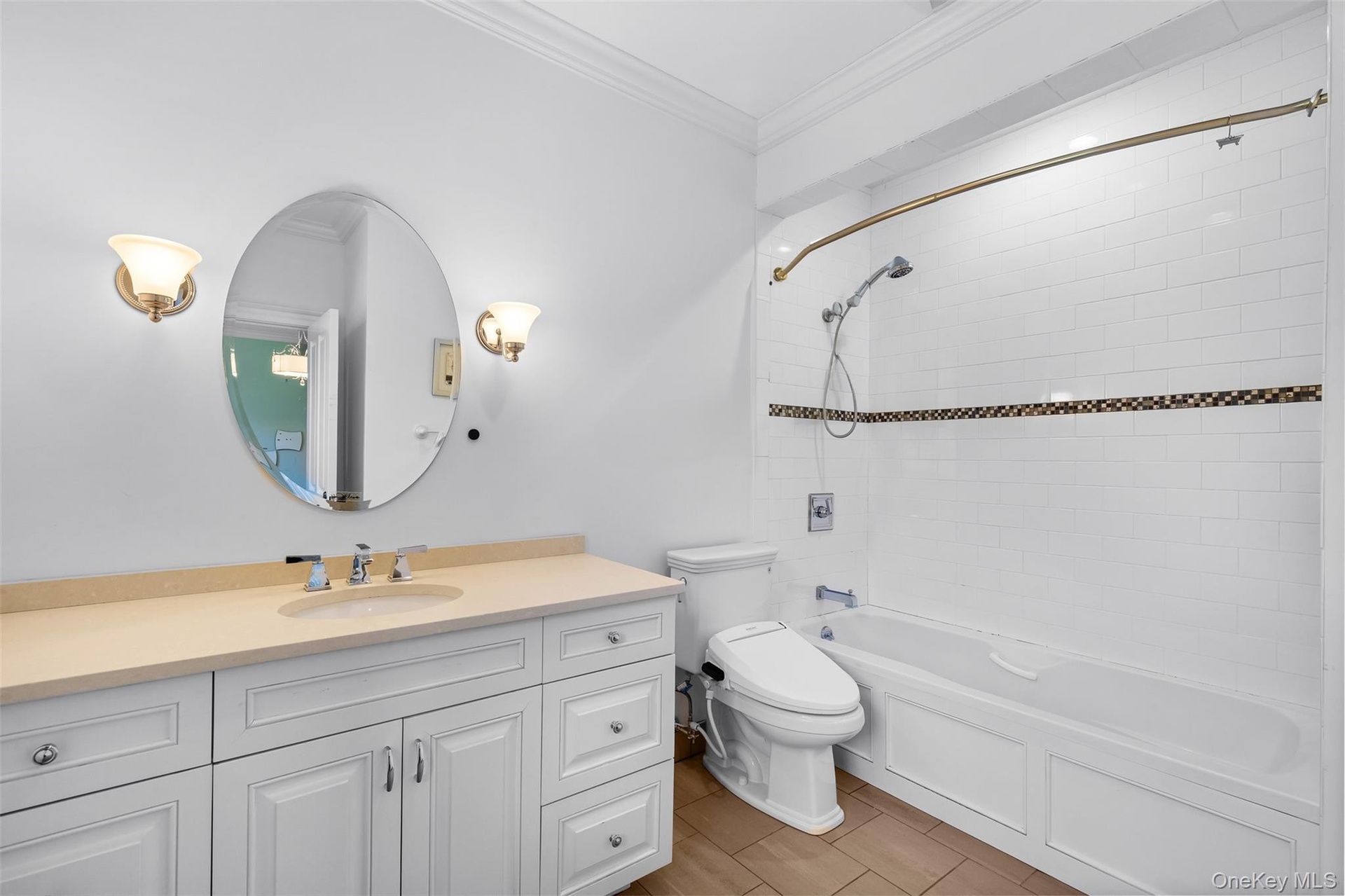 - Full bath with a shower stall, ornamental molding, a freestanding tub, double vanity, and light marble finish flooring