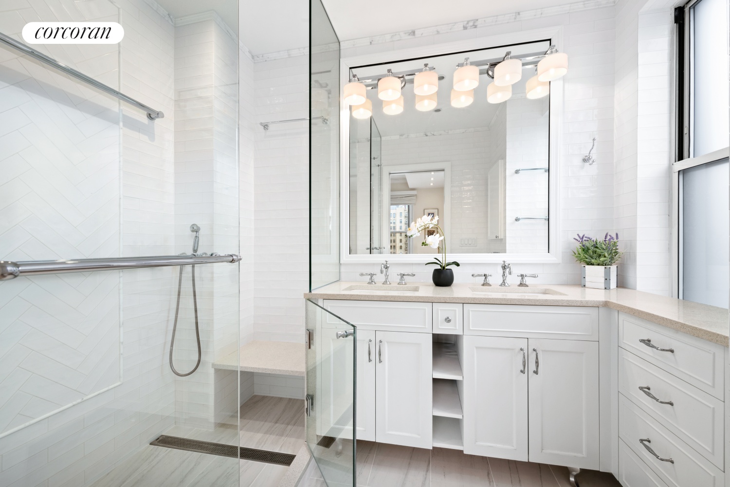 A key feature of this home is its thoughtful separation of the bedroom wings. The private corner primary suite is a tranquil retreat, with open southern and eastern exposures, custom built-in cabinetry, generous walk-in closets, and a spacious, windowed en-suite bath with double vanity and spa shower. A separate wing on the other side of the apartment houses three additional generously sized bedrooms - one currently used as a home office - each with excellent closet space, abundant light, and access to two beautifully renovated full bathrooms, one en-suite.