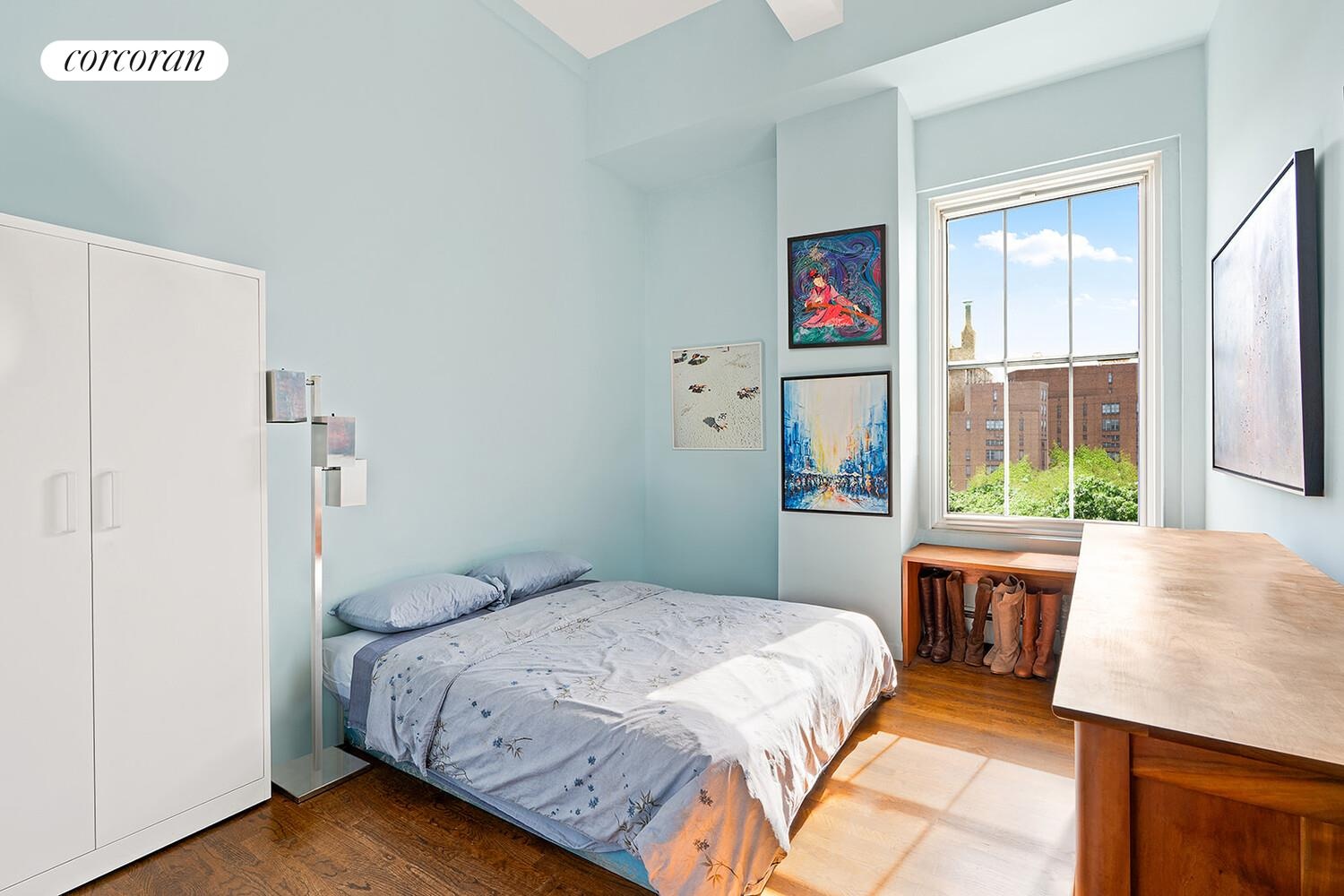 The residence's thoughtful layout maximizes both natural light and privacy, offering a balance of volume and intimacy in an oversized one-bedroom home. Generous closets and abundant overhead storage further add to the apartment's appeal.