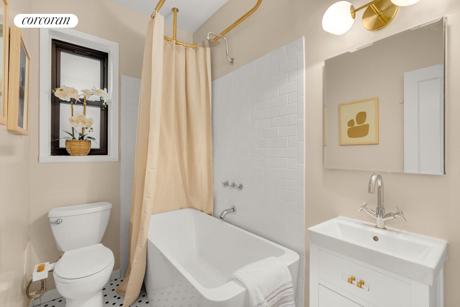 The recently updated bathroom boasts chic tilework, a deep soaking tub, and stylish new lighting. Freshly painted walls, new fixtures, and refinished hardwood floors complete this perfect picture.