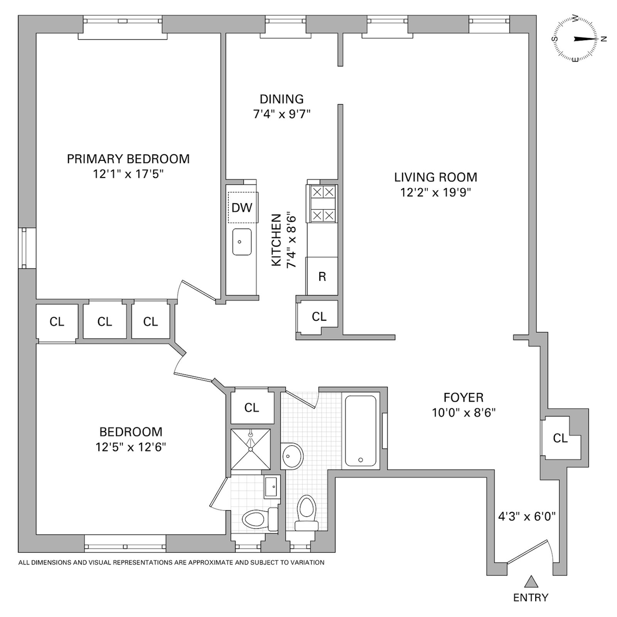 Situated on the 5th floor in the rear of the building, with stunning views over Brooklyn, the "T" line is arguably one of 360 Clinton's most desirable units. With a gracious layout, oversized rooms,10 windows on three exposures, lots of closets and pre-war details, this apartment could be a comfortable forever home. The entry foyer leads to a large west facing living room, with windowed eat in kitchen just beyond. A classic full sized hall bathroom keeps visitors away from the sleeping quarters. If California Kings are on your wish list, the corner bedroom has ample space with some to spare. And the second bedroom has its own ensuite bath with stall shower. The apartment boasts the original oak floors throughout.