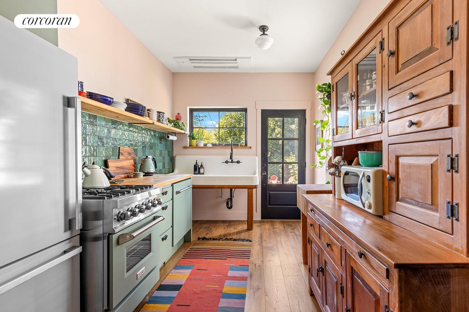 The renovated eat-in kitchen is both stylish and functional, featuring updated appliances, butcher block countertops, and a farmhouse sink. A rear door opens to a serene, country-sized backyard and garden - your own private retreat, perfect for summer barbecues or relaxing after a long day.