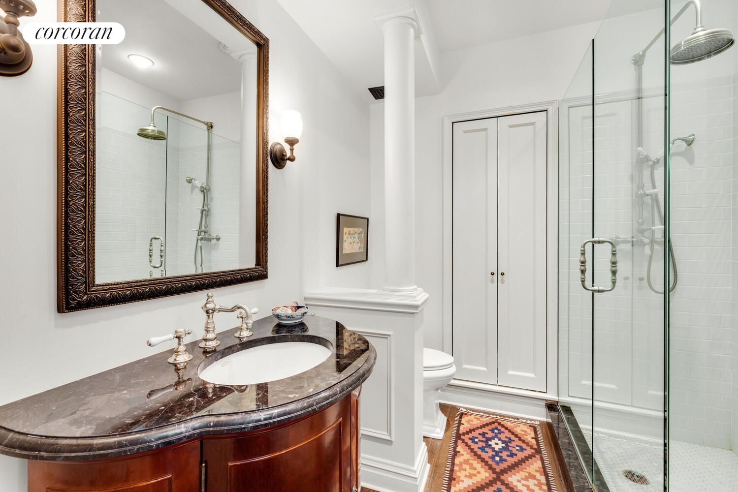 Off the entry foyer is a private hallway to the bathroom and bedroom, a great place for hanging artwork. The 12 x 12 foot king-sized sunlit, south-facing bedroom is spacious enough for a dresser and seating, and features a wall of beautifully appointed closets with mirrored doors and a cove ceiling reaching 9 feet 7 inches in height. The elegant bathroom includes a granite-topped vanity and walk-in shower with Waterworks and Coventry fixtures, and a spacious closet housing a convenient WASHER DRYER.