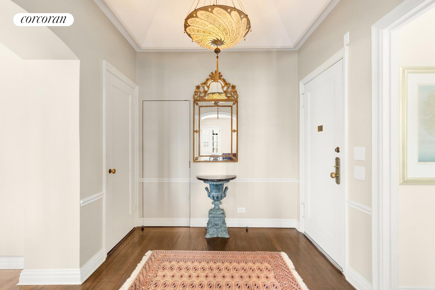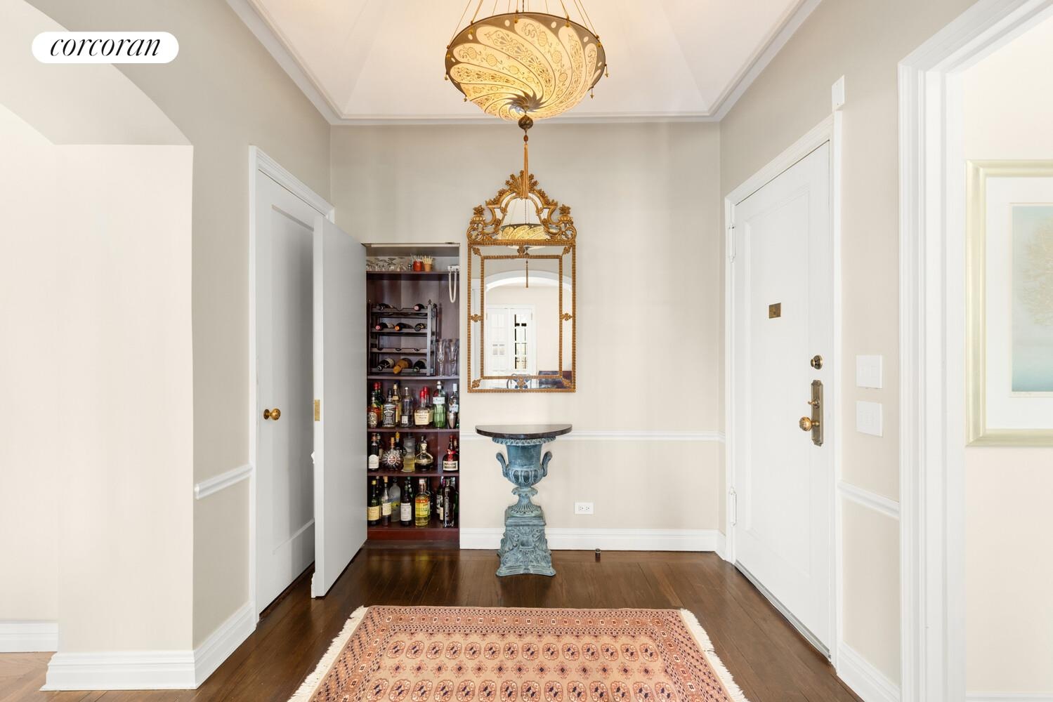 Upon greeting your guests in the elegant and spacious foyer with its 10 foot + cove ceiling, coat closet and smartly-designed bar closet, you're all set to take them through the arched doorway to the sunlit 24 x 15 living room showcasing a working wood burning fireplace, a large walk-in closet (which some residents convert into a home office), high double cove ceilings, and wonderful south-facing views through recently installed new casement windows. Alternatively, you can take your guests in through the columned entryway of the dining room which seats 4 to 6 people comfortably, and is equipped with built-in storage and is also with a high cove ceiling. French doors from the dining room lead into the bright windowed kitchen, a chef's dream! It features elegant soapstone countertops, tastefully appointed wood cabinetry, and high-end appliances including a Viking gas range, paneled Subzero fridge freezer, paneled Miele dishwasher, and Dacor microwave oven.