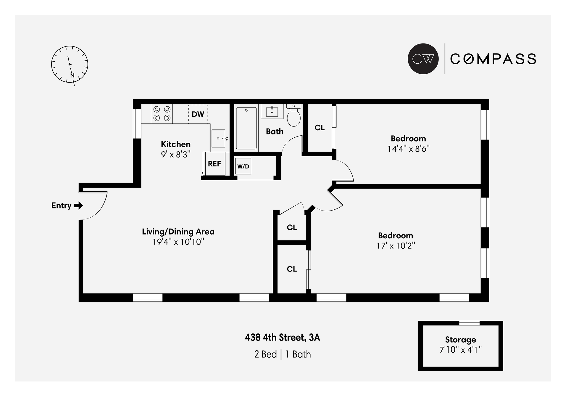 Enter into the spacious living room and dining room with two windows that opens into the updated windowed kitchen. The kitchen is equipped with stainless steel appliances, dishwasher and microwave included, ample cabinet space, and Calacatta Bello Quartz countertops. There are two separate bedrooms, including a king-size primary with four windows and a roomy secondary bedroom with a generous closet. The recently renovated bathroom boasts a soaking tub, Toto toilet, and Delta fixtures. Hardwood floors are found throughout. An in-unit washer/dryer combo is also included, as is a private, windowed storage room.