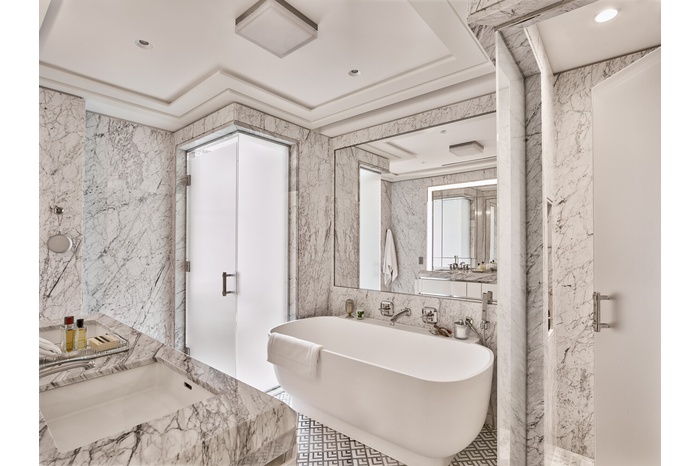 The primary bedroom has a large walk-in closet. The windowed five- fixtured bathroom features floor-to-ceiling honed white Bianca Carrara marble slab walls and radiant heated custom designed mosaic marble tile floor. A custom double vanity with polished Luna Gray marble countertop, elegant stainless-steel legs, and integrated lighting provides exceptional storage complementing the cabinet with integrated lighting, mirror and concealed electric outlet. The freestanding custom designed deep soaking tub offers a thoughtful shelf and sits below a large custom wall mirror featuring fixtures and fittings that are custom forged in polished nickel, exclusively for Waldorf Astoria Residences.