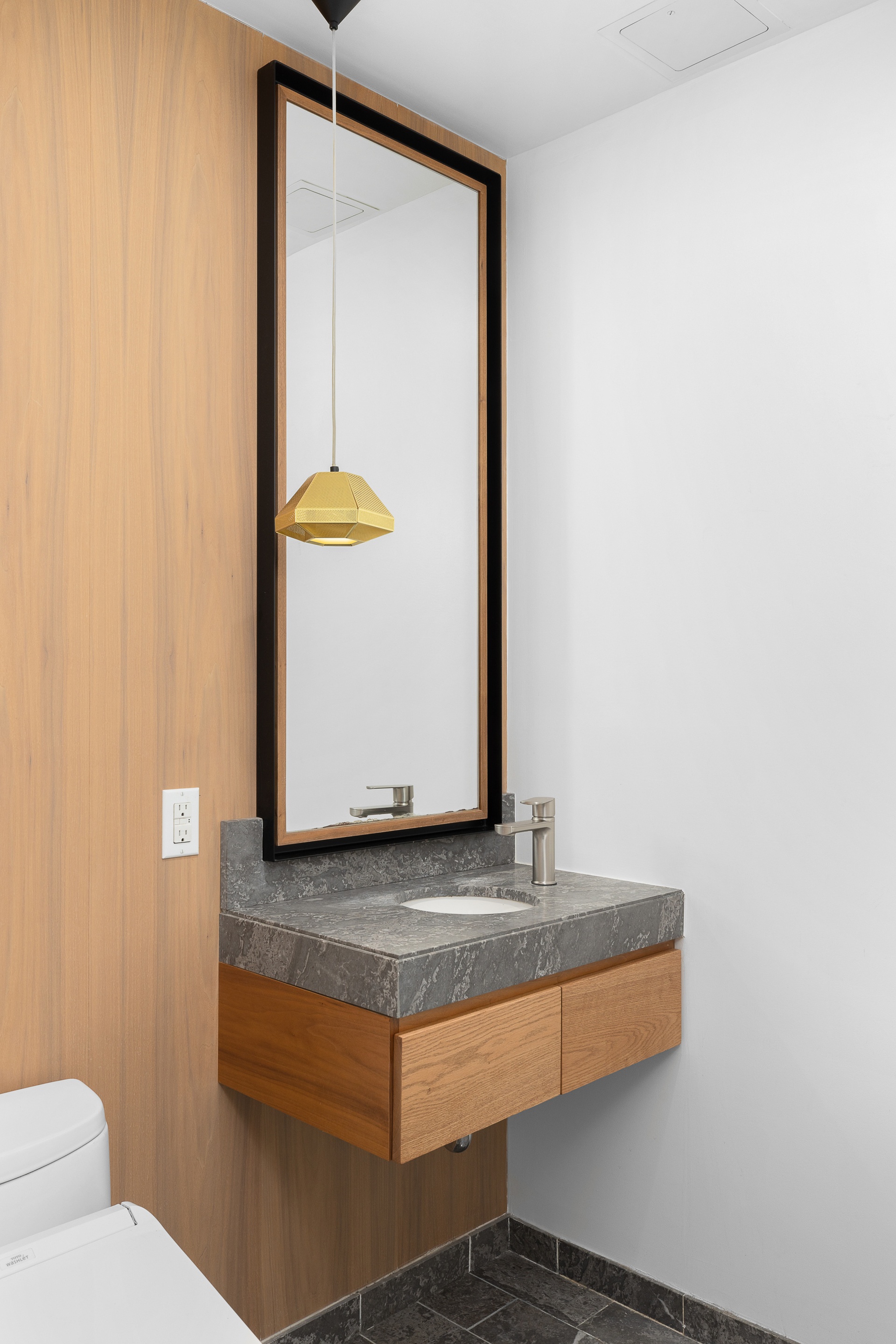 A powder room, with bleached walnut vanity and stone flooring, leads the way to the bedrooms and bathrooms. The primary suite features a walk-in dressing room and spa-like bath with Sivec marble wall tile, Tundra Grey honed marble floors, a glass-enclosed shower with custom teak insert, and a custom oak vanity topped with marble. Waterworks fixtures and a full-height mirrored medicine cabinet complete the elevated design. Secondary bedrooms are spacious and filled with natural light, each with oversized windows framing blue sky and neighborhood views. Additional conveniences include central air and heat, in-unit stackable Bosch washer/dryer, and abundant closet space.