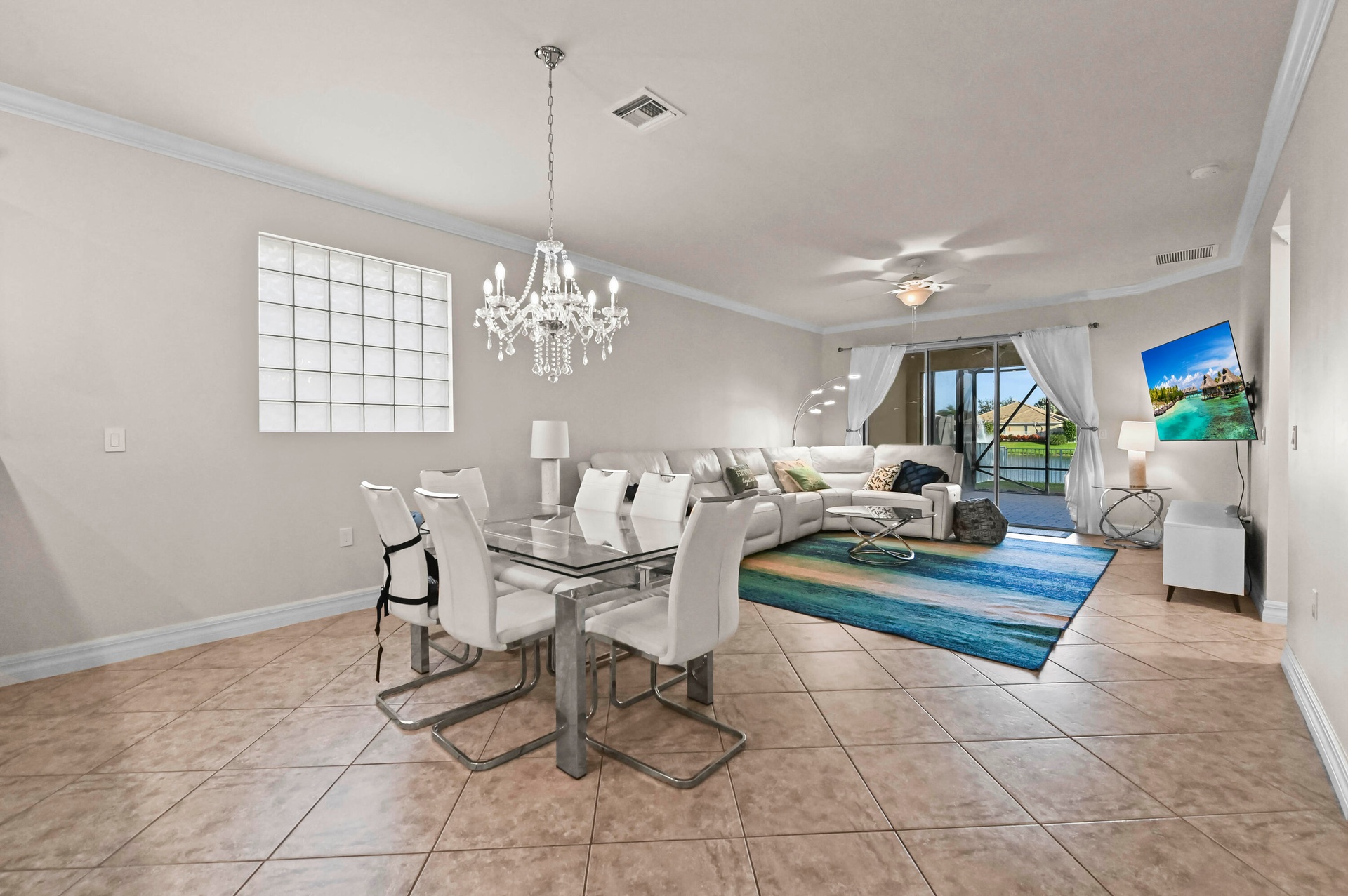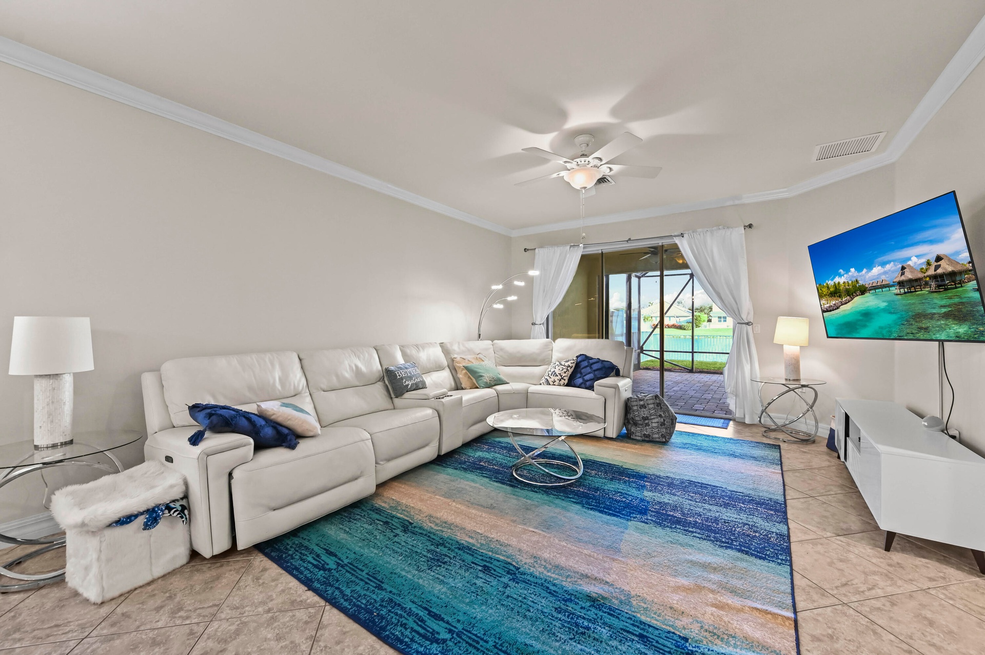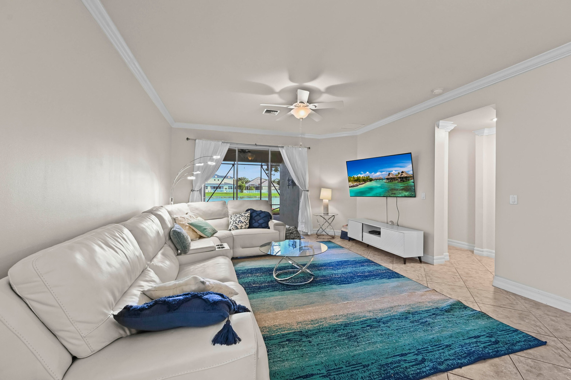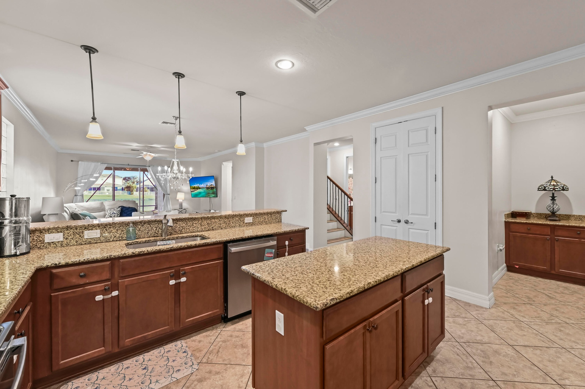 Welcome to this stunning home, perfectly situated on a serene waterfront lot within the beautifully maintained gated community, Oak Haven. The residence offers fantastic curb appeal with a paver driveway, lush landscaping, and a welcoming screened front porch. Step inside to an office that could be used as a 5th bedroom then into the bright, open-concept living area defined by neutral tile flooring, fresh paint, and elegant crown molding, flowing seamlessly into the gourmet kitchen. This central space features warm wood cabinetry, dark granite countertops, and stainless steel appliances, creating a highly functional and stylish area for both daily living and entertaining.